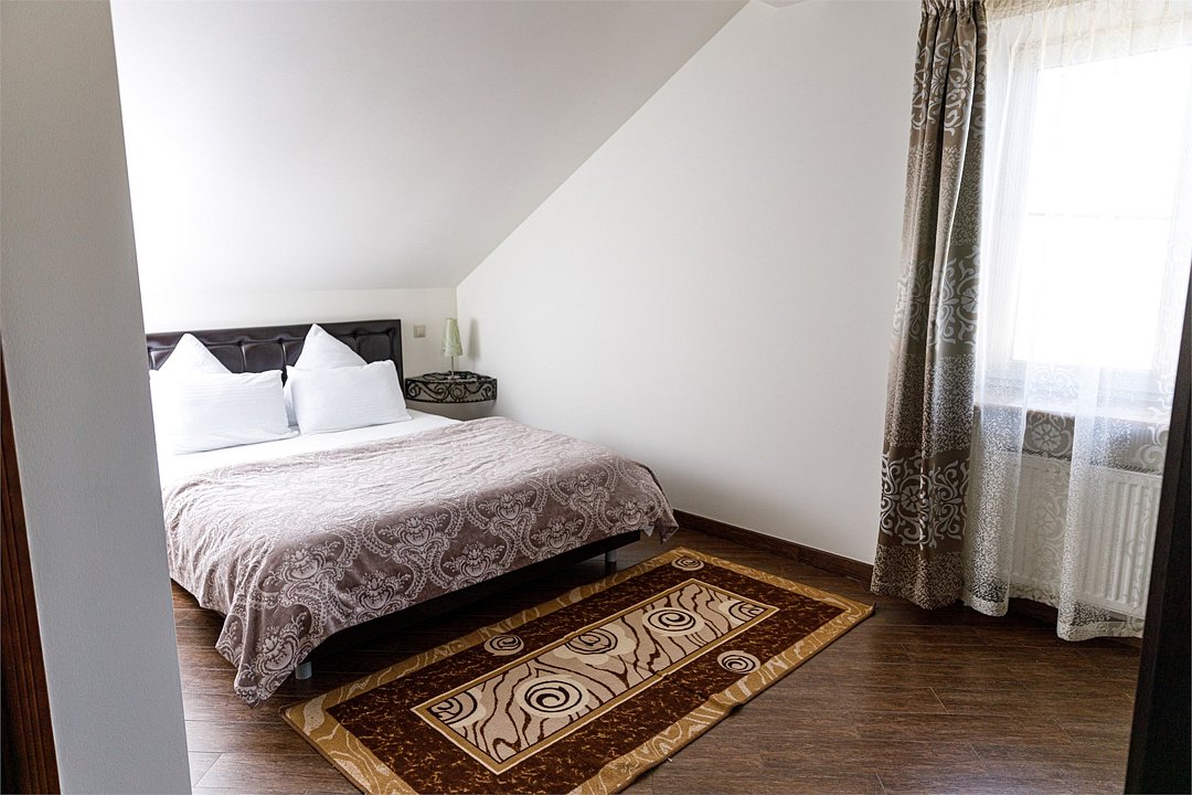Стандартная комната располагается на цокольном этаже коттеджей. Комната меблирована большой двуспальной кроватью. Так же в комнате есть телевизор, шкаф для одежды с зеркалом, кофейный столик с двумя пуфами. Постельное белье из 100% хлопка. Дополнительные места для взрослых и детей старше 3-х лет, в данной категории комнат не предоставляются. Возможно размещение детей до 3-х лет в детской кроватке. В ванной комнате есть: биде, душевая кабина, раковина, унитаз, набор полотенец, гель для душа, шампунь.Услуги и удобства