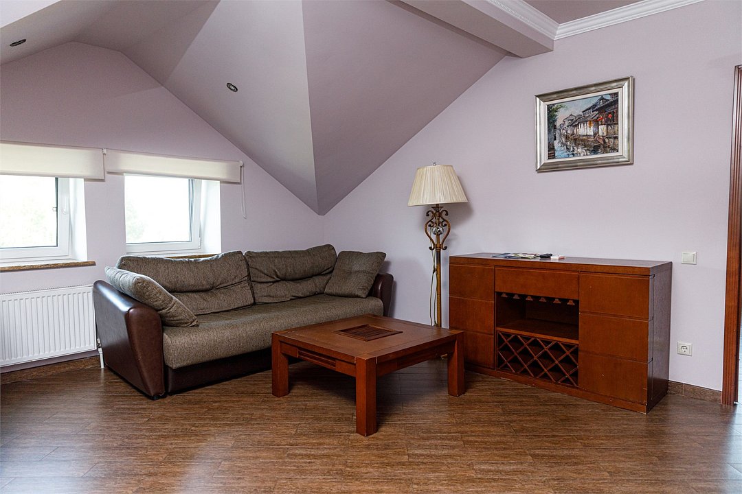 Люкс плюс находится на третьем этаже каждого коттеджа. Самая большая комната площадью 70 кв.м. меблирована большой двуспальной кроватью, вместительным шкафом, телевизором и большим диваном. В комнате есть декоративный балкон (вынос мебели запрещен). В ванной комнате есть душ, диван, биде и туалет.Услуги и удобства