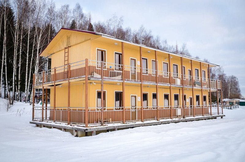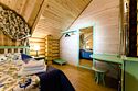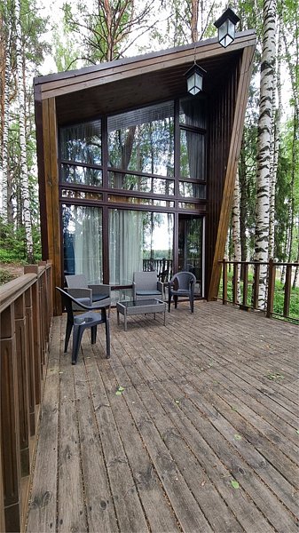 Необычный дом, второй из серии таких домов, идеально вписанный в природную среду, с панорамными окнами на кроны деревьев и водную гладь Двухэтажный дом — идеальный вариант для проживания семьи с детьми в коттедже или для пары. Имеет открытую уличную смотровую и пикниковую площадку, которая расположена непосредственно над открытым пространством. На первом этаже: гостиная с телевизором, мини-холодильником и раскладным диваном на 2 спальных места, мини-кухня с барной стойкой, санузел с душевой кабиной, на втором этаже — спальня с бокс-кроватями, которые могут быть преобразованы как в 1 большую кровать, так и в 2 раздельных кровати без потери удобства.
