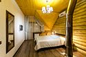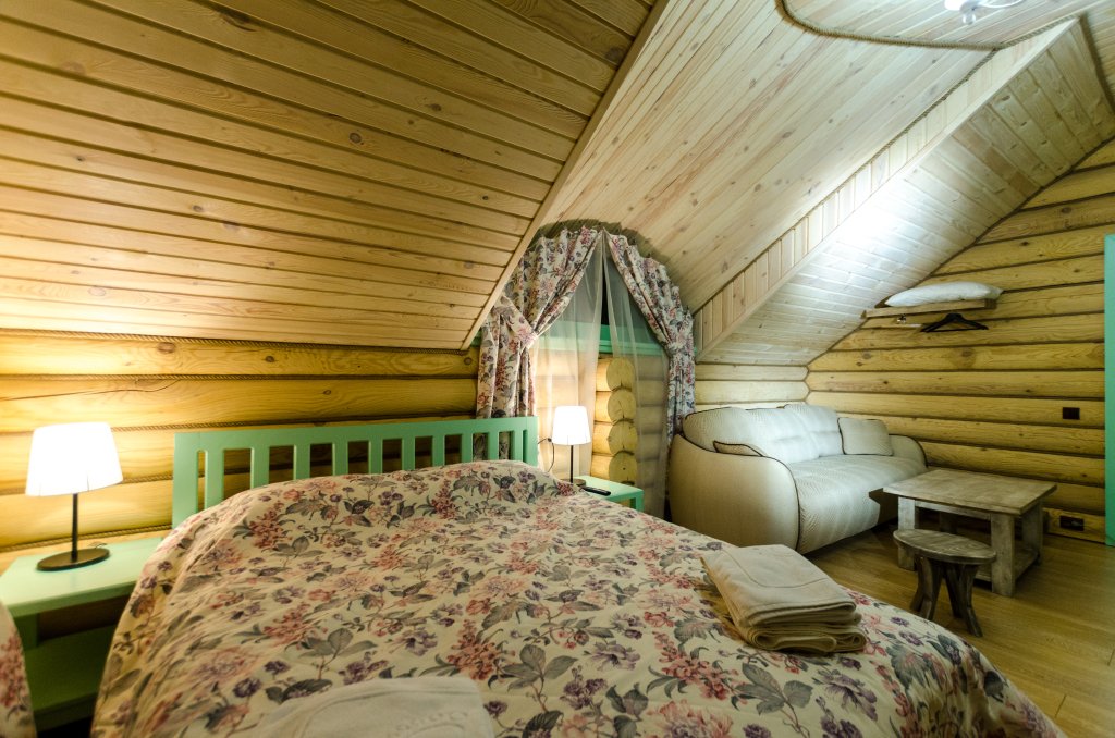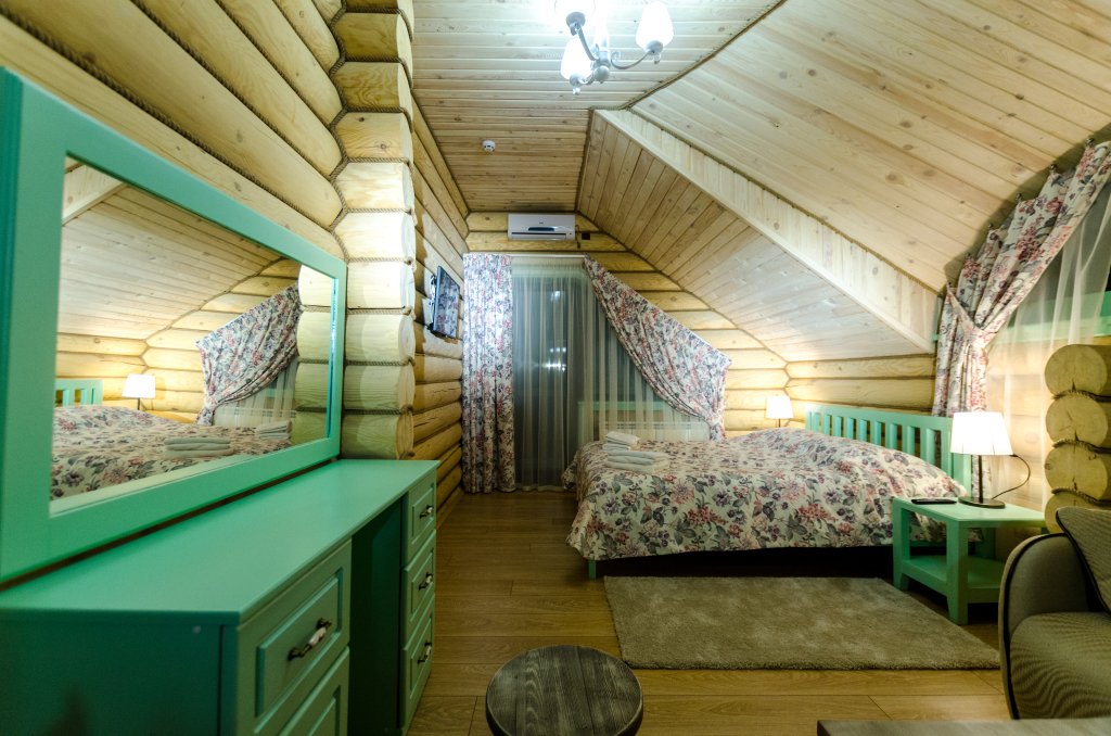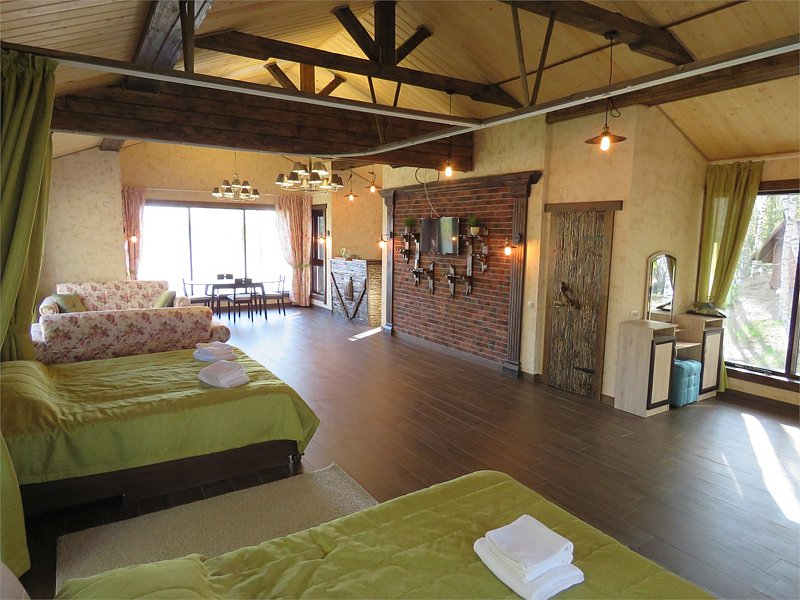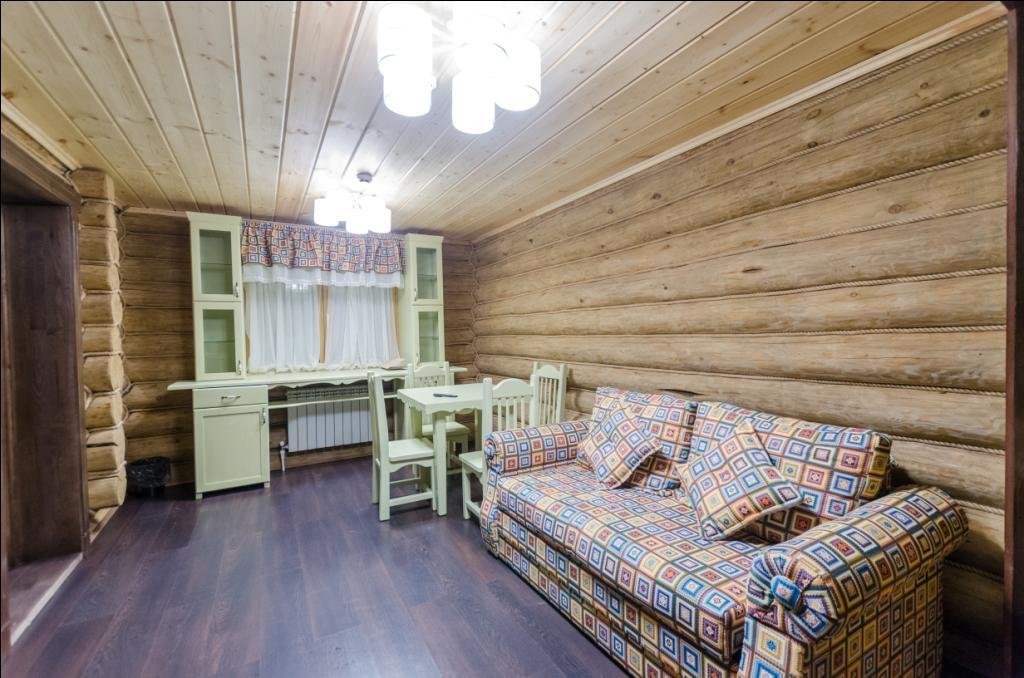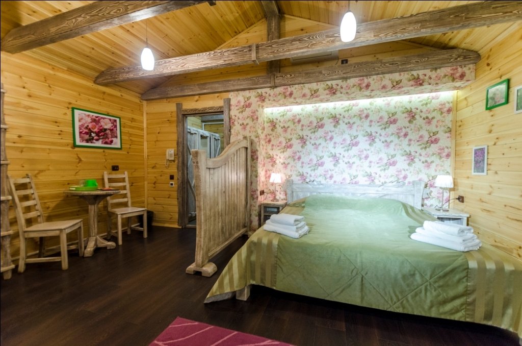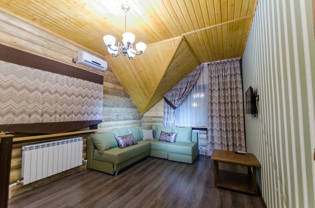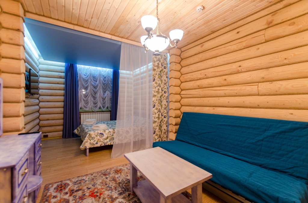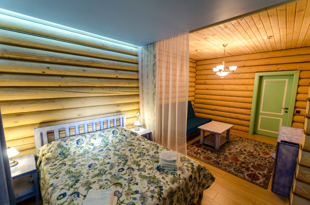 2-х комнатный номер с отдельным входом, занимает весь 1 этаж дома из бревен на 2 номера, располагается недалеко от основного корпуса. Интерьер номера выполнен в старорусском стиле, лучшем для отдыха на природе и смены обстановки после городской квартиры. Вся мебель и осветительные приборы ручной работы. Номер рассчитан для проживания семьи или небольшой компании. В спальне — двуспальная кровать и раскладной диван, в гостиной — мягкая зона с раскладным диваном, телевизор, санузел с душевой кабиной.