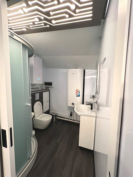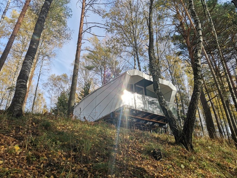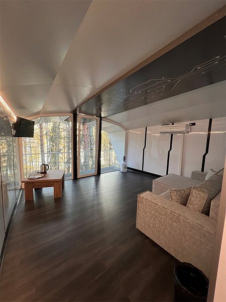 Легкий функциональный и теплый гостевой дом, созданный для комфортного круглогодичного проживания семьи до 5 человек. Это не просто дом. Снаружи — футуристический звездолет, готовый в любой момент отправиться в межгалактическое путешествие, изнутри — комфортный современный дом, отвечающий всем необходимым требованиям. В доме 2 комнаты. Спальня и гостиная с прекрасным видом на лес и реку. Санузел оснащен всеми технологиями.