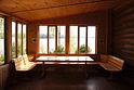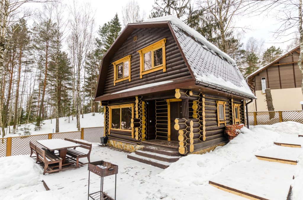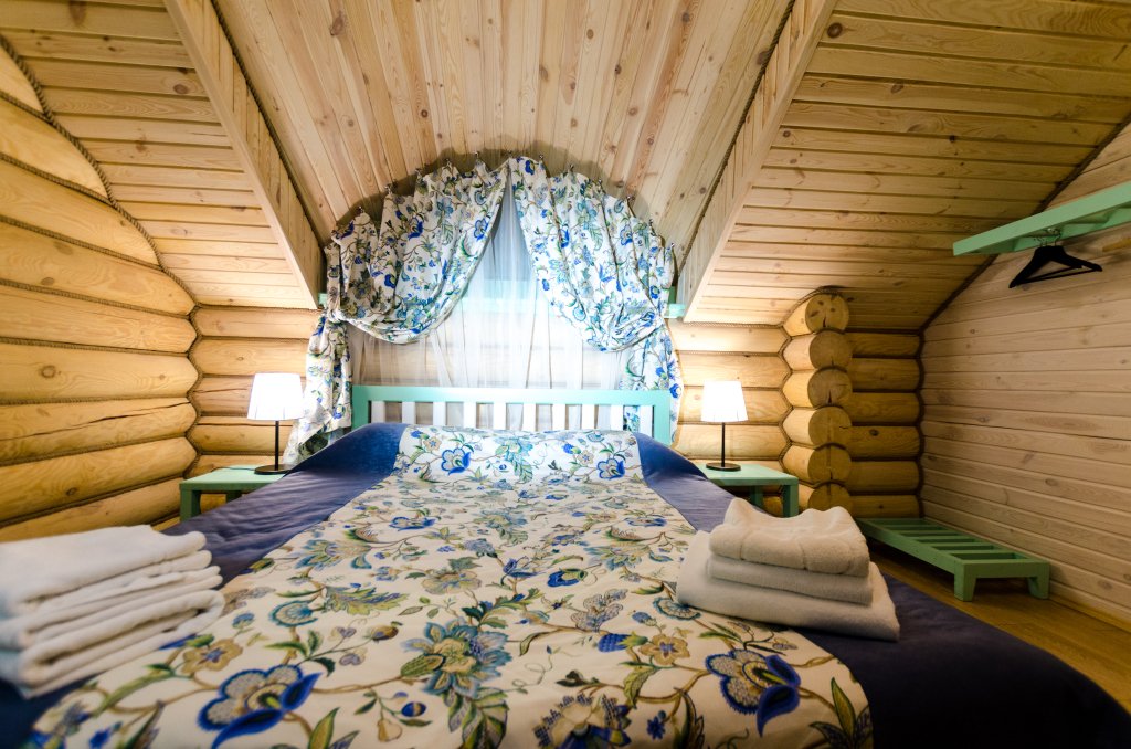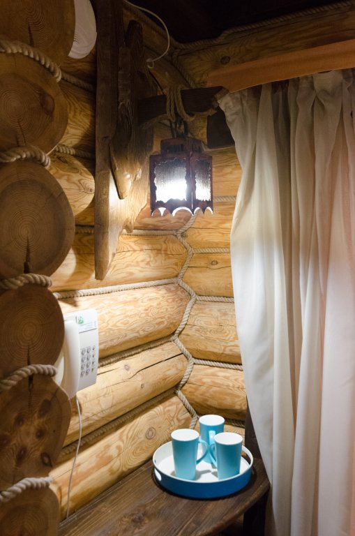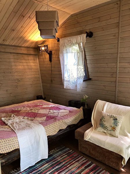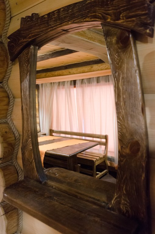 Уютный домик на двоих, своим видом напоминающий добрую старую сказку, находится в самой дальней части комплекса — на берегу реки Мера. В доме почти вся мебель ручной работы, изготовленная одним из лучших мастеров края: бревенчатая деревянная двуспальная кровать, кресло-кровать, журнальный столик. В санузле оригинально разместилась раковина непосредственно между двумя большими стволами дерева. Панорамное окно с очаровательным видом, балкон в стиле «домика бабы-яги» с выходом на террасу, откуда открывается вид на воду. Также дом оснащен всей необходимой техникой: телевизор, электрический чайник, мини-холодильник. Под домом расположена индивидуальная площадка для барбекю с мангалом и комфортной зоной отдыха.