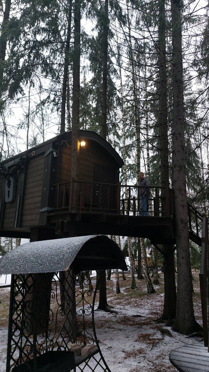 Необычный дом на дереве. Для тех кто мечтал о нем с детства. Идеально вписанный в природную среду, с панорамными окнами на кроны деревьев и водную гладь. Дом небольшой, но очень сказочный. Рассчитан на 2 основных места. Имеет открытую уличную смотровую и пикниковую площадку, которая расположена непосредственно над открытым пространством.