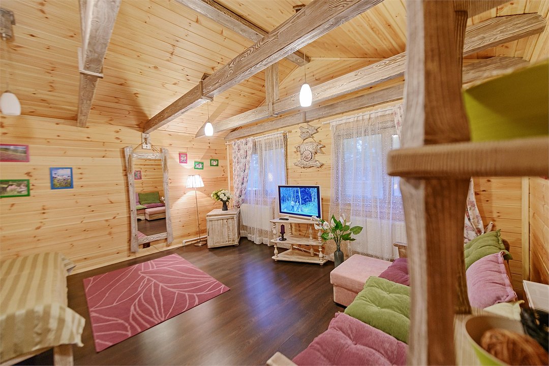Уютный домик на двоих, своим видом напоминающий добрую старую сказку, находится в самой дальней части комплекса — на берегу реки Мера. В доме почти вся мебель ручной работы, изготовленная одним из лучших мастеров нашего края: бревенчатая деревянная двуспальная кровать, кресло-кровать, журнальный столик.