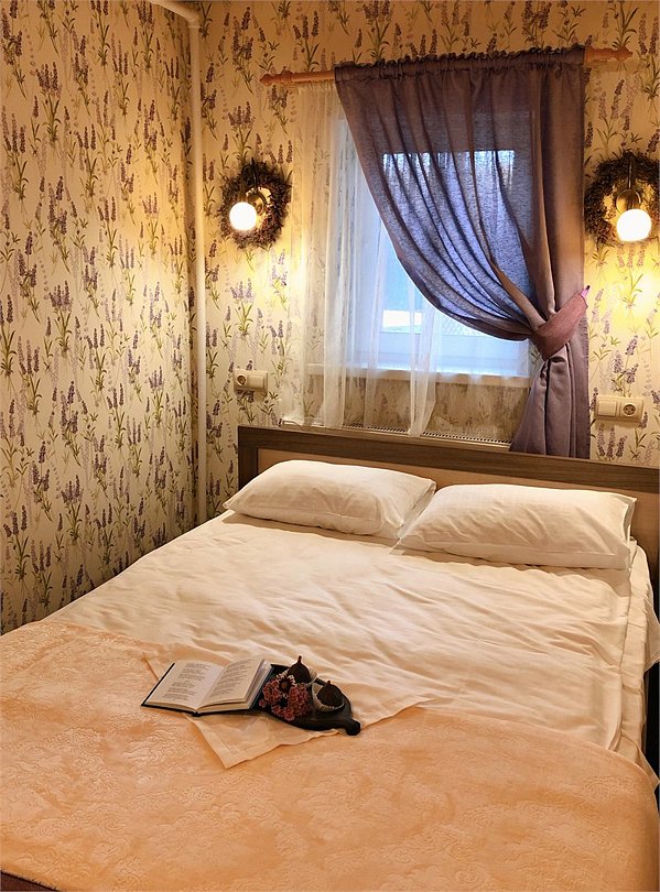 Вся мебель и осветительные приборы ручной работы. Площадь номера 35 м, рассчитан для проживания семьи или небольшой компании. В спальне двуспальная кровать и раскладной диван, в гостиной мягкая зона с раскладным диваном, телевизор, санузел с душевой кабиной.