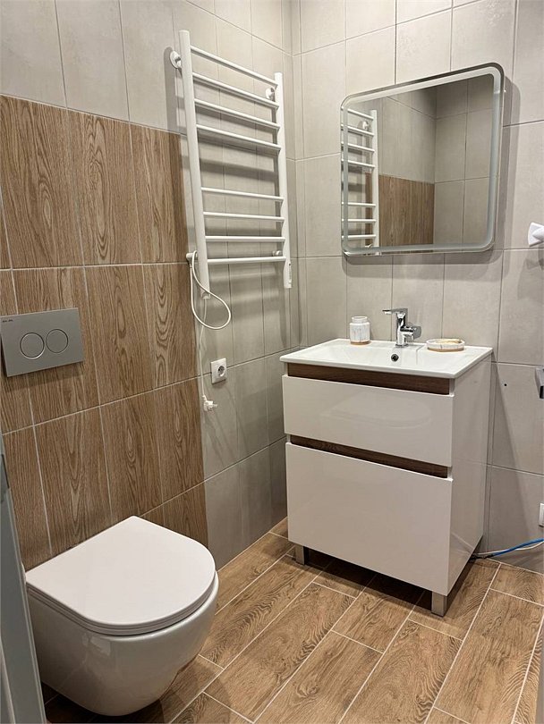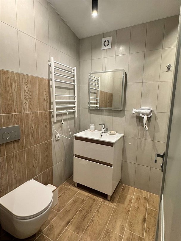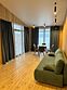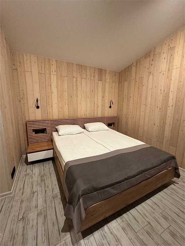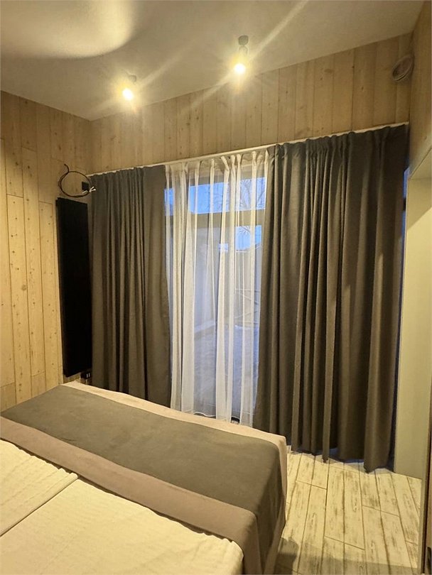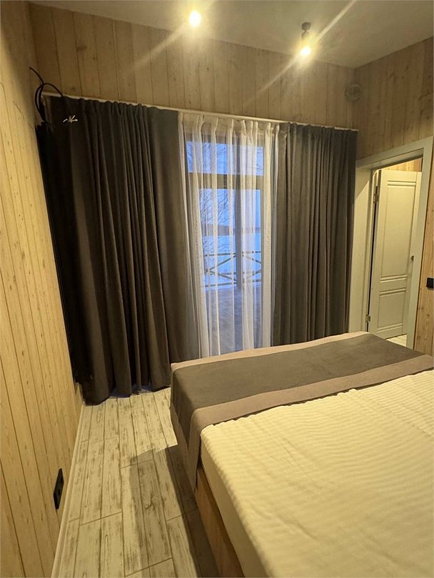 На первом этаже — гостиная с телевизором и раскладным диваном на два спальных места, зона мини-кухни с барной стойкой, санузел с душевой кабиной, на втором этаже — спальня с бокс-кроватями, которые могут быть преобразованы как в большую кровать, так и в два раздельных кровати без потери удобства.