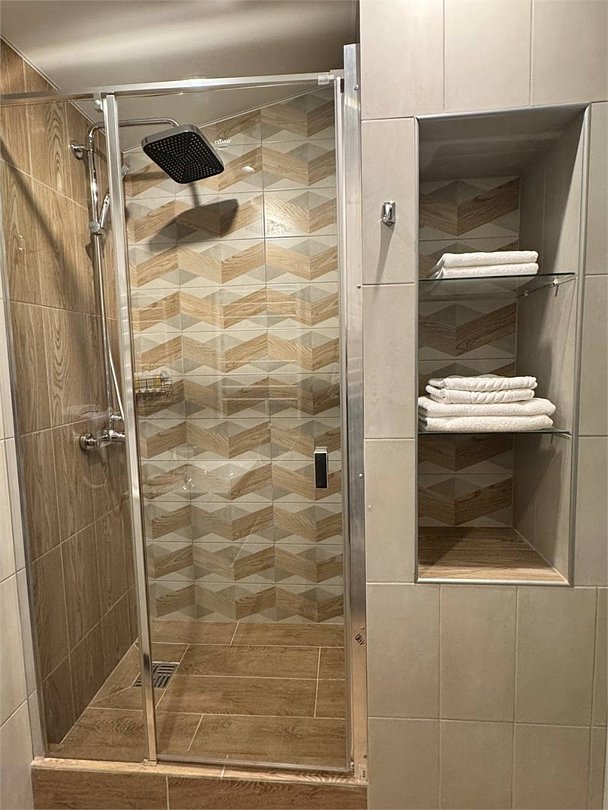 В номере — большая кровать, мягкий уголок, телевизор, мини-холодильник, столик с двумя стульями, чайник и чайный набор. В прихожей — большой платяной шкаф. Санузел с душевой кабиной.