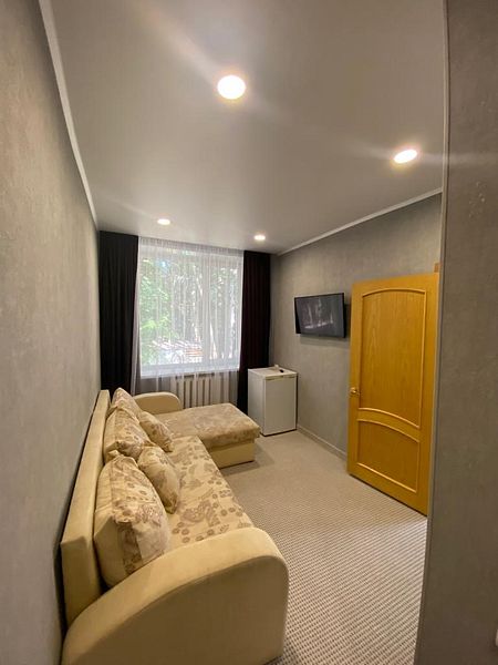 2 комната - раскладывающийся диван, журнальный стол, холодильник, чайник, комплект посуды.