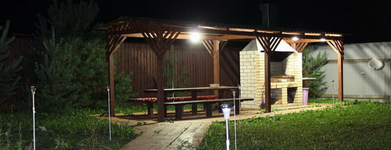 Мангал находится под крытым навесом, рядом для большего удобства размещен стол и лавки