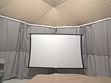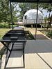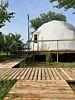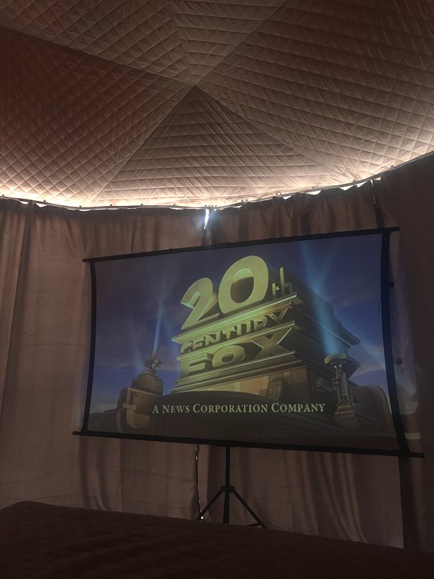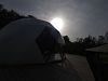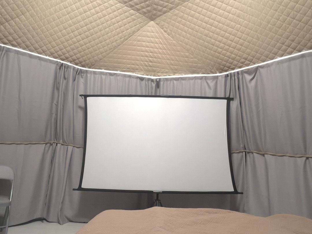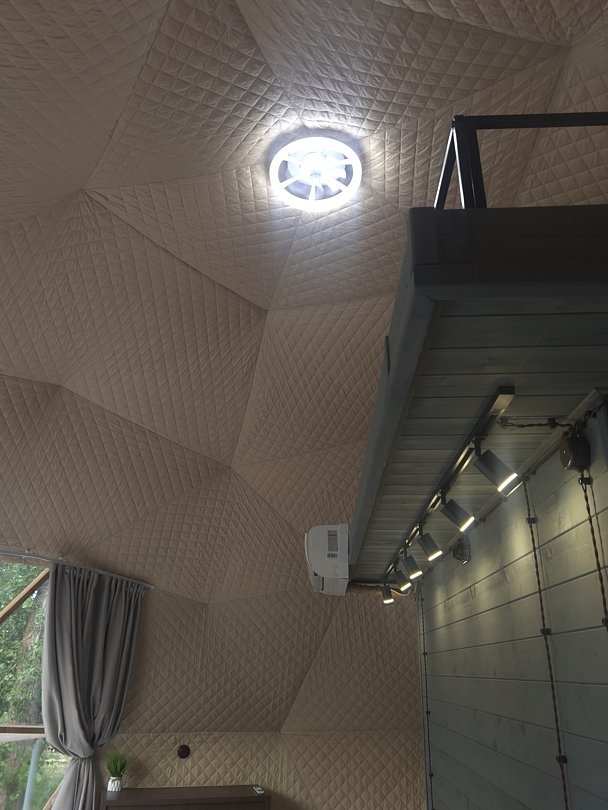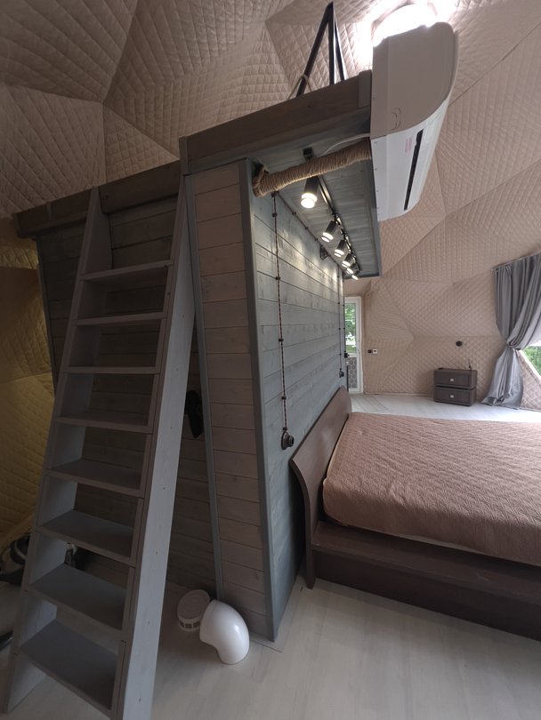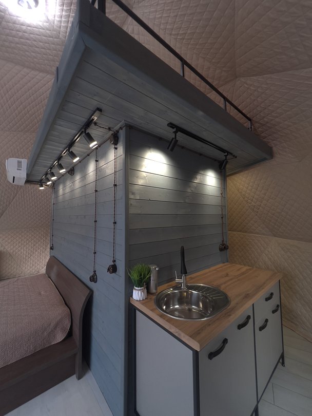 Купольный дом вмещает в себя: санузел с душевой, двуспальная кровать 200 на 160 (на первом ярусе), две односпальных кровати 200 на 90 (на втором ярусе), дополнительное место — место раскладушка, небольшая кухня, зона отдыха (столик со стульями, комод). Посередине купола установлен домашний кинотеатр, который доставит вам удовольствие от просмотра любимых фильмов.