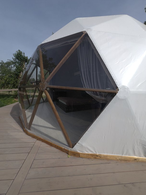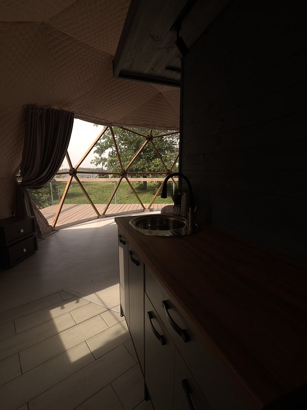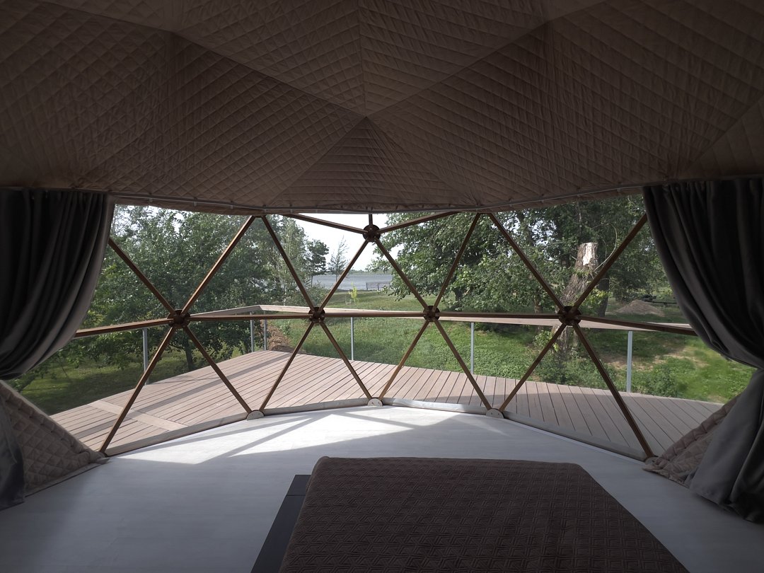 Внутреннее пространство геокупола создано с особым вниманием к деталям, чтобы обеспечить вам полное погружение в отдых и уют. Огромные панорамные окна пропускают естественный свет и открывают вид на реку.