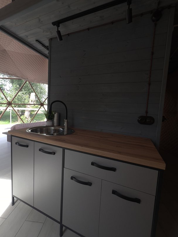 Просторный геокупол оснащен всем необходимым для максимально комфортного проживания и позволит разместиться всей семьёй или компанией из 4-5 человек.
