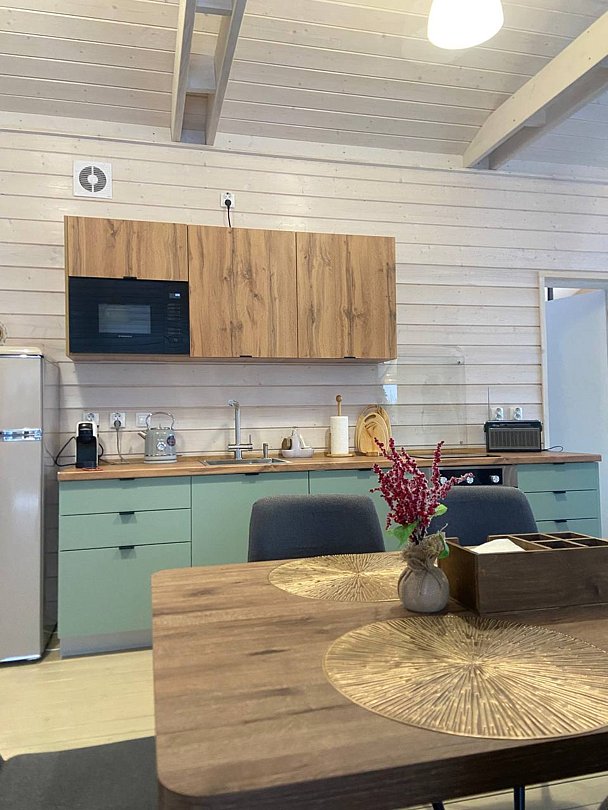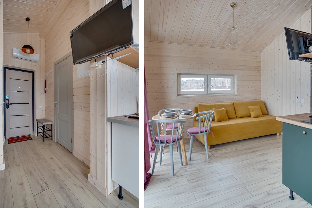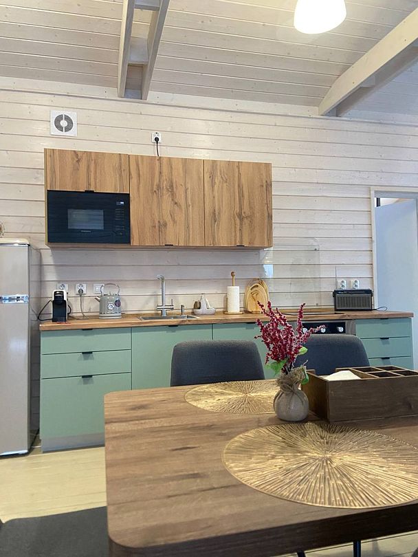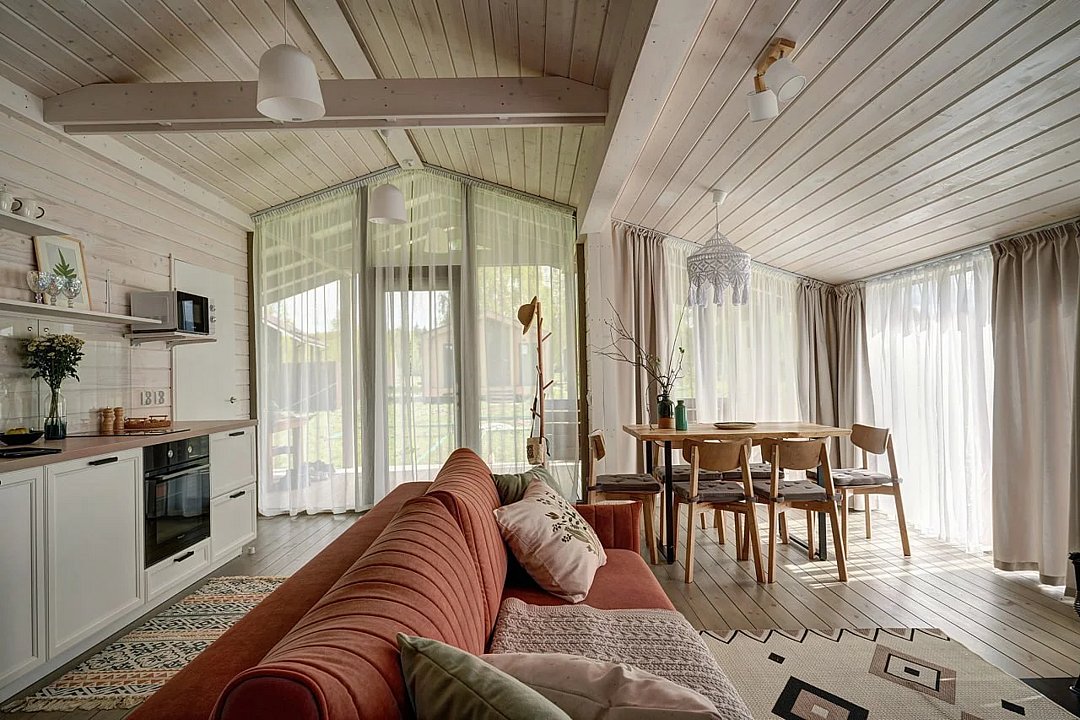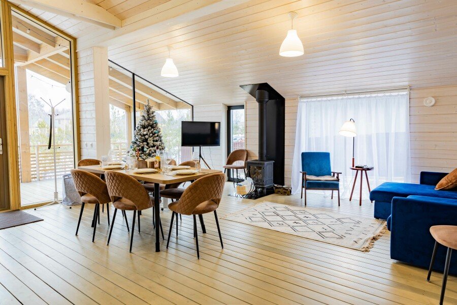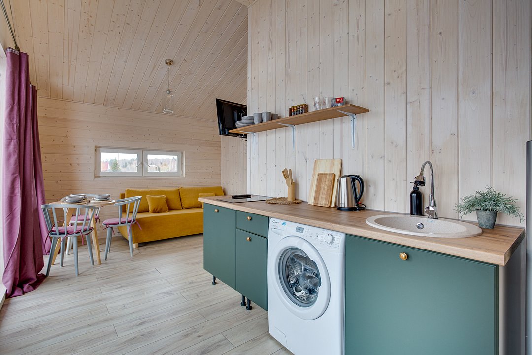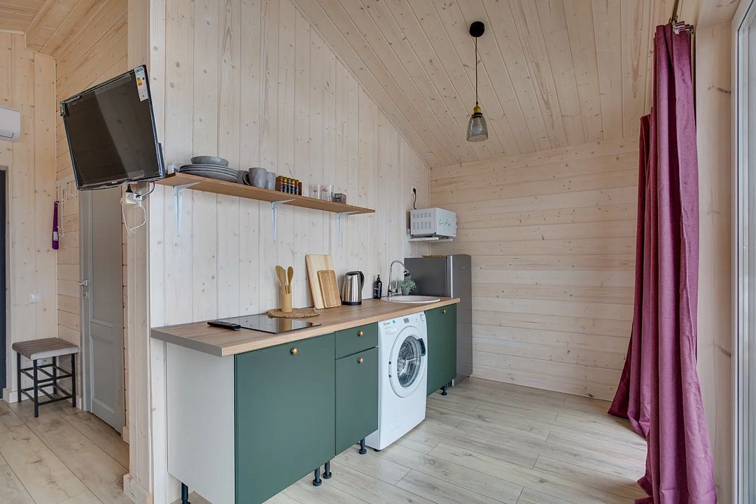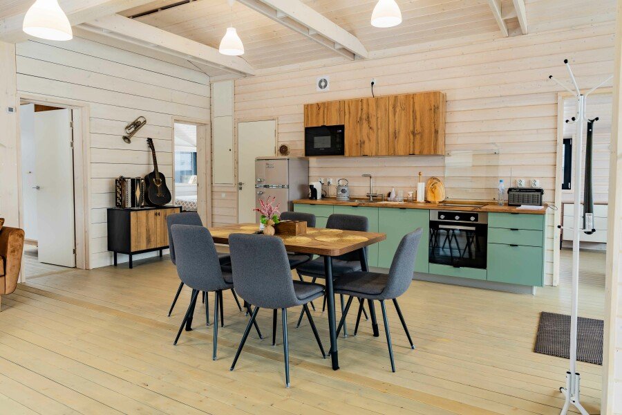 Комфортабельные дома оборудованы всем необходимым: телевизором со Smart TV, посудомоечной и стиральной машинами, духовкой, плитой, холодильником, капсульной кофемашиной, полным комплектом посуды, феном, утюгом и высокоскоростным интернетом. Постельное белье, полотенца, моющие и гигиенические средства предоставляются.