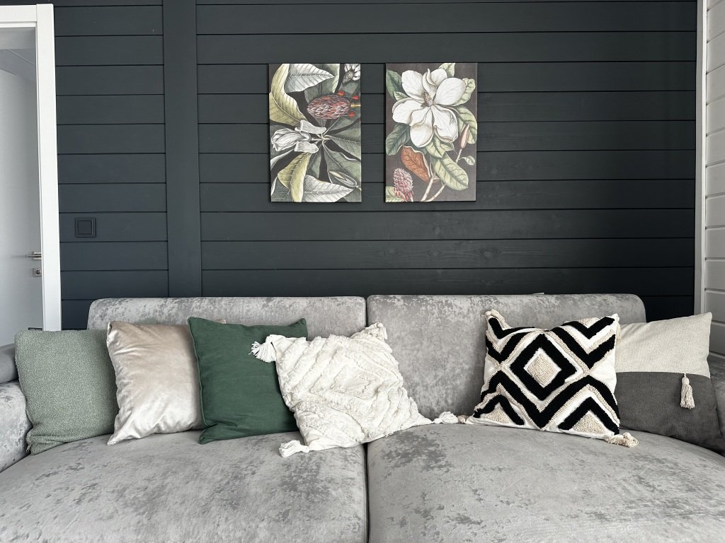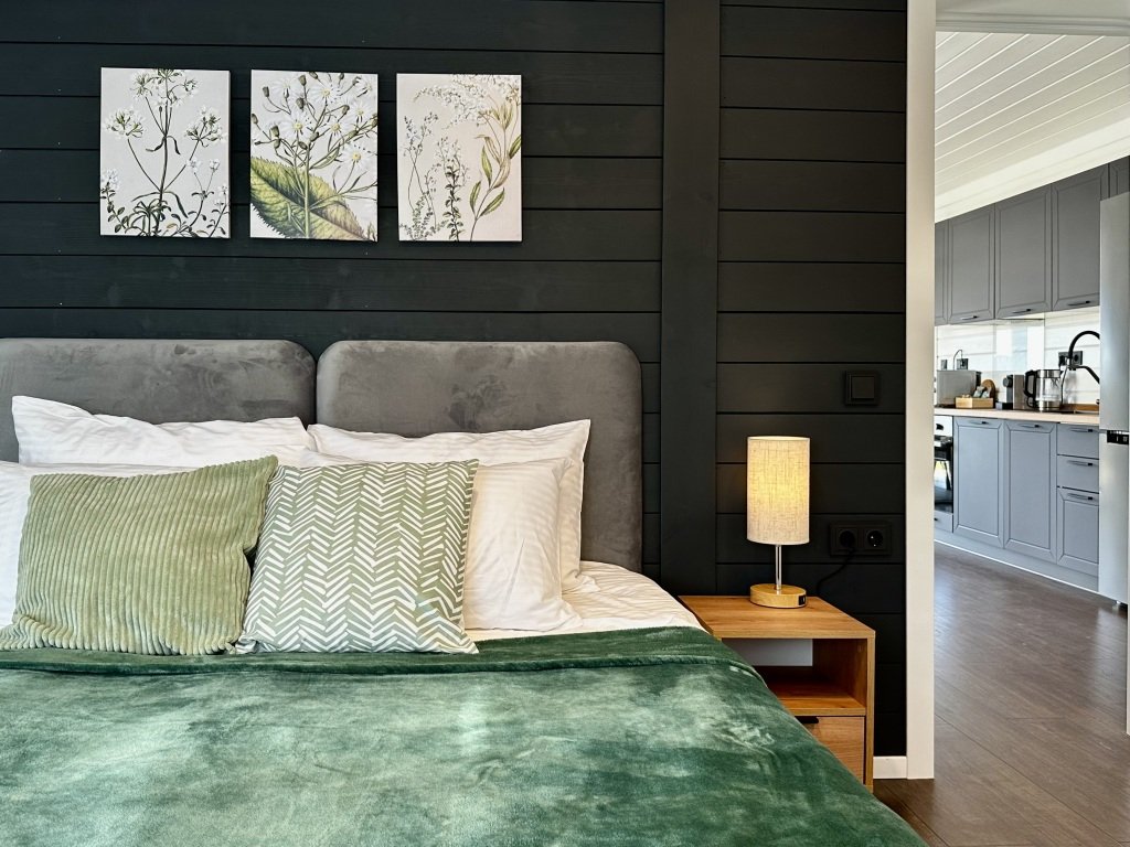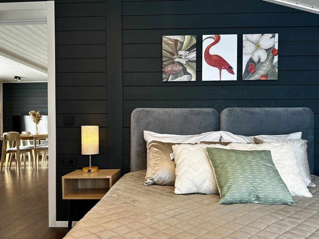 В доме 2 спальни. В распоряжении гостей 2 двуспальные кровати 160х200 см, которые можно трансформировать в 4 односпальные, а также раскладной диван и дополнительный матрас.