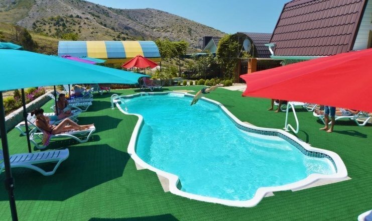 Междугородним автобусом до автостанции г.Судак, далее на такси до отеля (ул. Алчак Кая, 10).