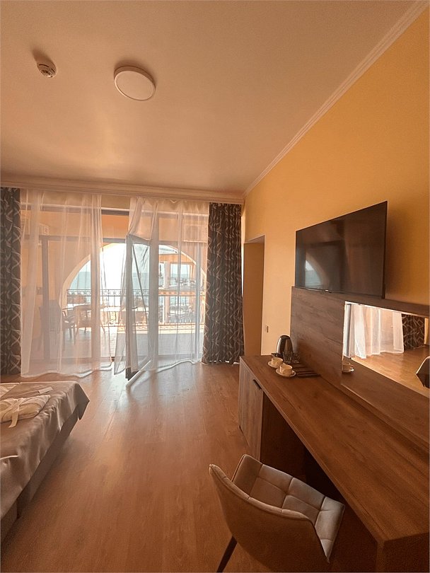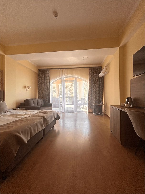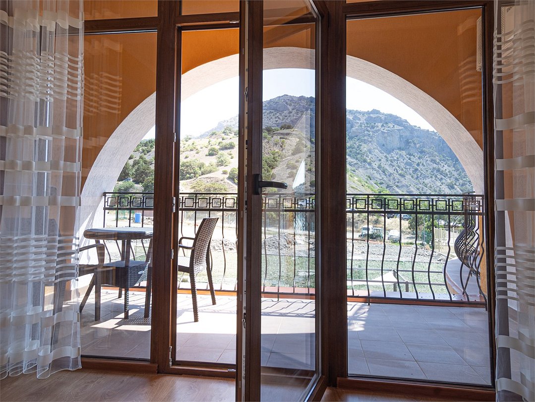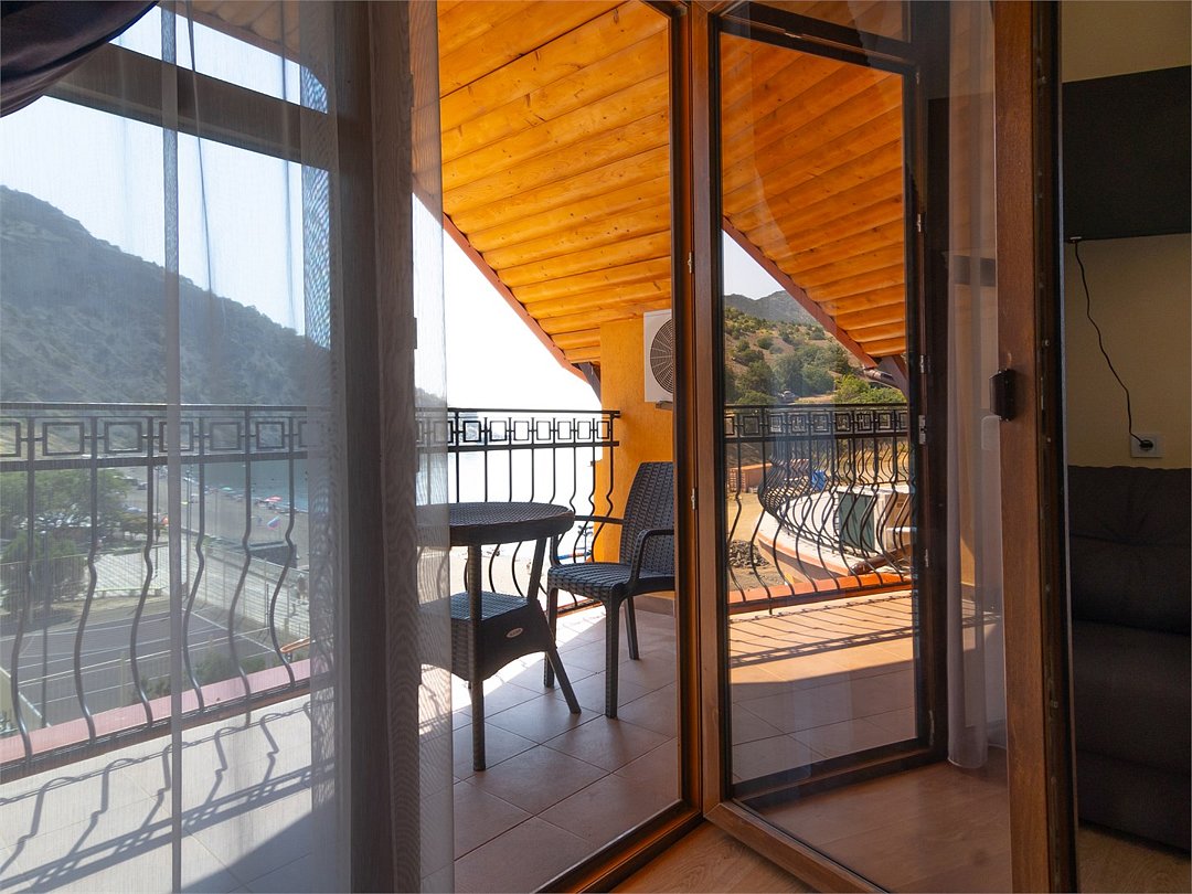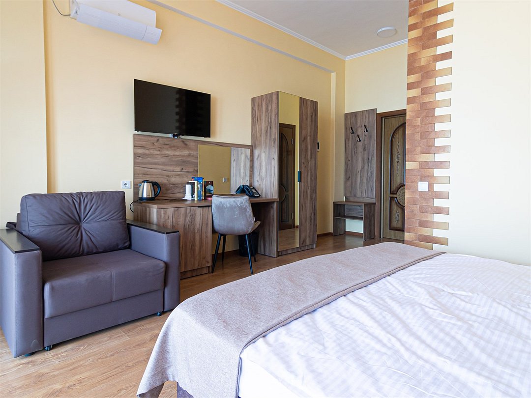 Однокомнатный номер с одной двуспальной кроватью или двумя раздельными кроватями и балконом с видом на море и горы. Номер рассчитан на проживание до 2 человек. Площадь номера: 25м². Балкон/Лождия: терраса Вид из номера: на горы/море ❗️В номере: ЖК-телевизор Мини-бар Сплит-система Ванная комната Комфортабельная мебель ⛰ Что включено в ваше размещение: Уборка раз в 3 дня, услуги прачечной (платно) Для вашего комфортного пребывания в каждом номере есть удобства: тапочки, набор махровых полотенец, фен, косметический набор для душа. Завтрак Разрешено размещение с животными (по запросу)Услуги и удобства