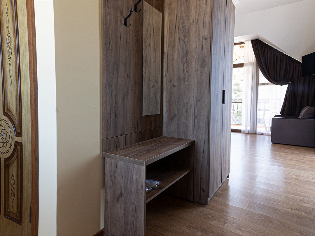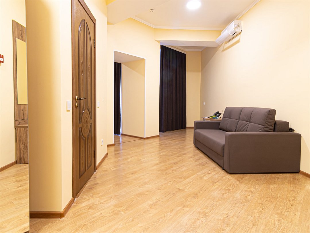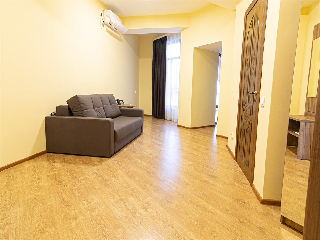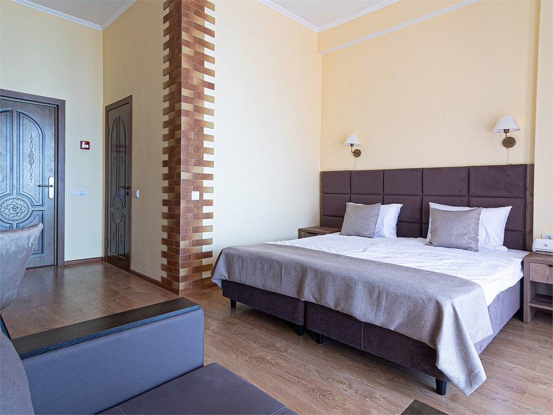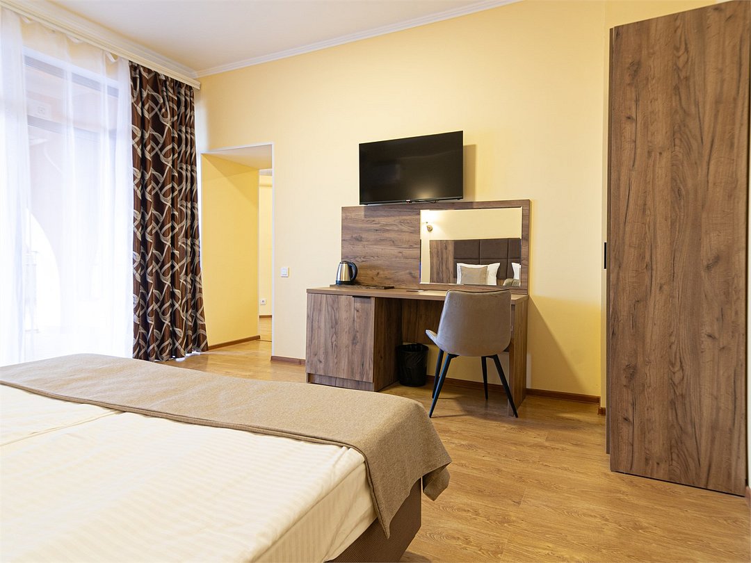 Двухкомнатный номер с одной двуспальной кроватью или двумя раздельными кроватями и диваном. В номере есть собственный балкон с видом на море и горы. Номер рассчитан на проживание до 4 человек. Площадь номера: 41м². Балкон/Лождия: терраса Вид из номера: на горы/море ❗️В номере: ЖК-телевизор Мини-бар Сплит-система Ванная комната Комфортабельная мебель ⛰ Что включено в ваше размещение: Уборка раз в 3 дня, услуги прачечной (платно) Для вашего комфортного пребывания в каждом номере есть удобства: тапочки, набор махровых полотенец, фен, косметический набор для душа. Завтрак Разрешено размещение с животными (по запросу)Услуги и удобства