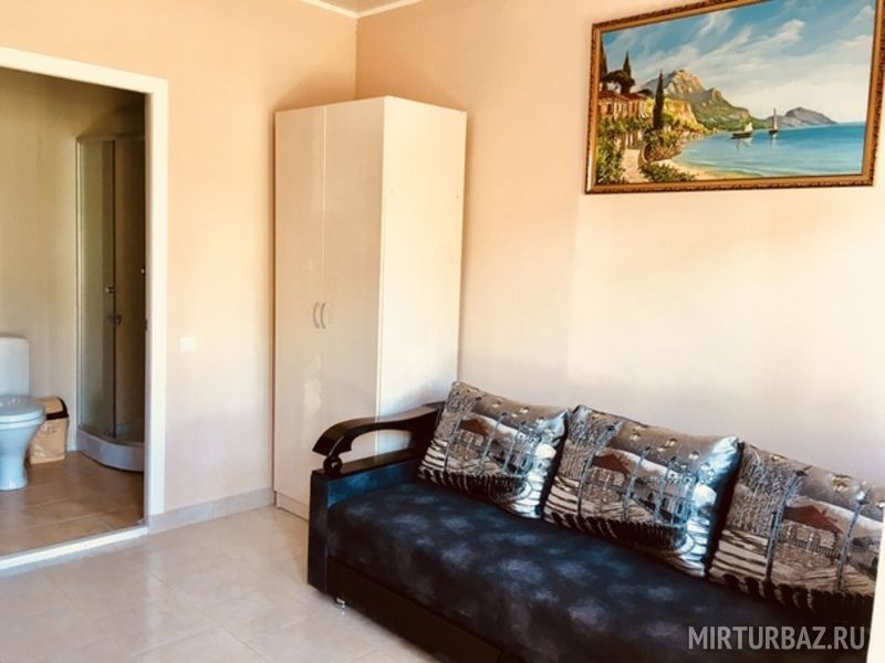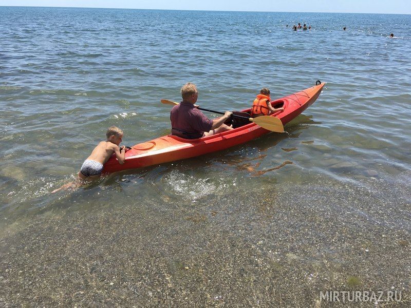 До моря 300 м, 3-4 минуты легким шагом по ровной дороге. Море очень чистое, прозрачное, на пляже мало людей. Пляж - песчано-галечный, много рыбы, крабов, рапанов. Есть так же специальный вход в море из мешков с песком и пирс. Так же в 50 м от основного пляжа есть залежи лечебной голубой глины!!!