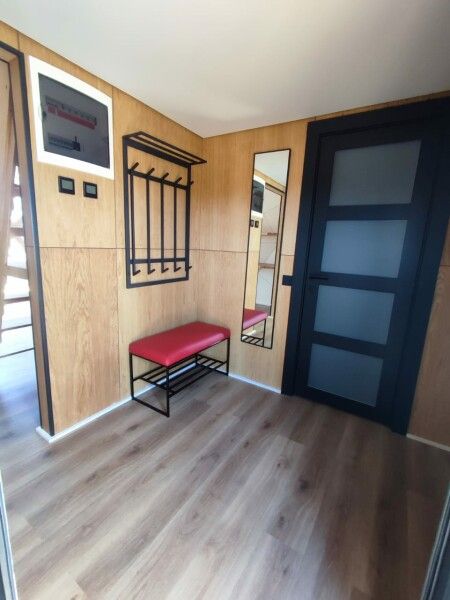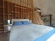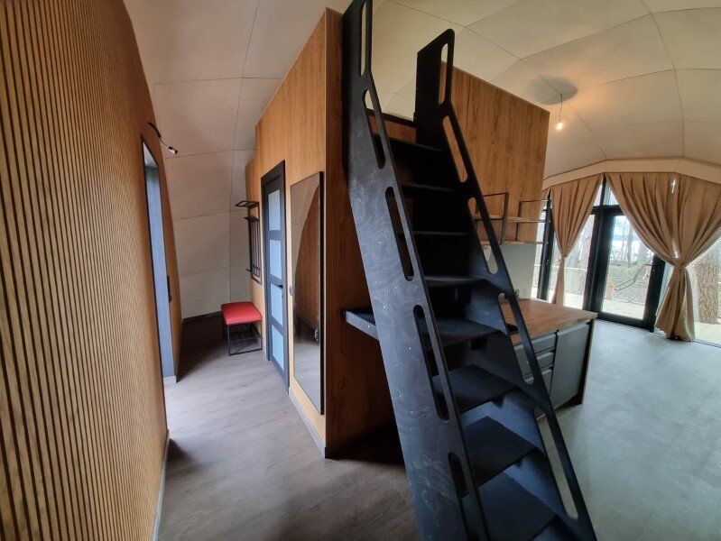 - мебель: двуспальная кровать, двуспальный матрас на втором этаже, вешалка для одежды, журнальный стол, стеллаж, прикроватные тумбочки, обеденный стол, стулья;