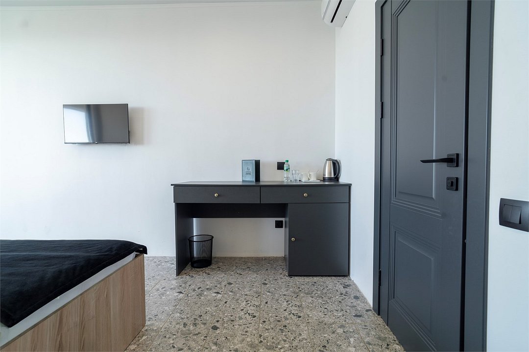Двухместный однокомнатный номер с одной общей кроватью, с балконом и видом на море. Номера данной категории расположены на 3 и 4 этажах во 2 корпусе. Максимальное количество гостей - 2 человека. Проживание 1-го ребенка до 4 лет бесплатно.Услуги и удобства