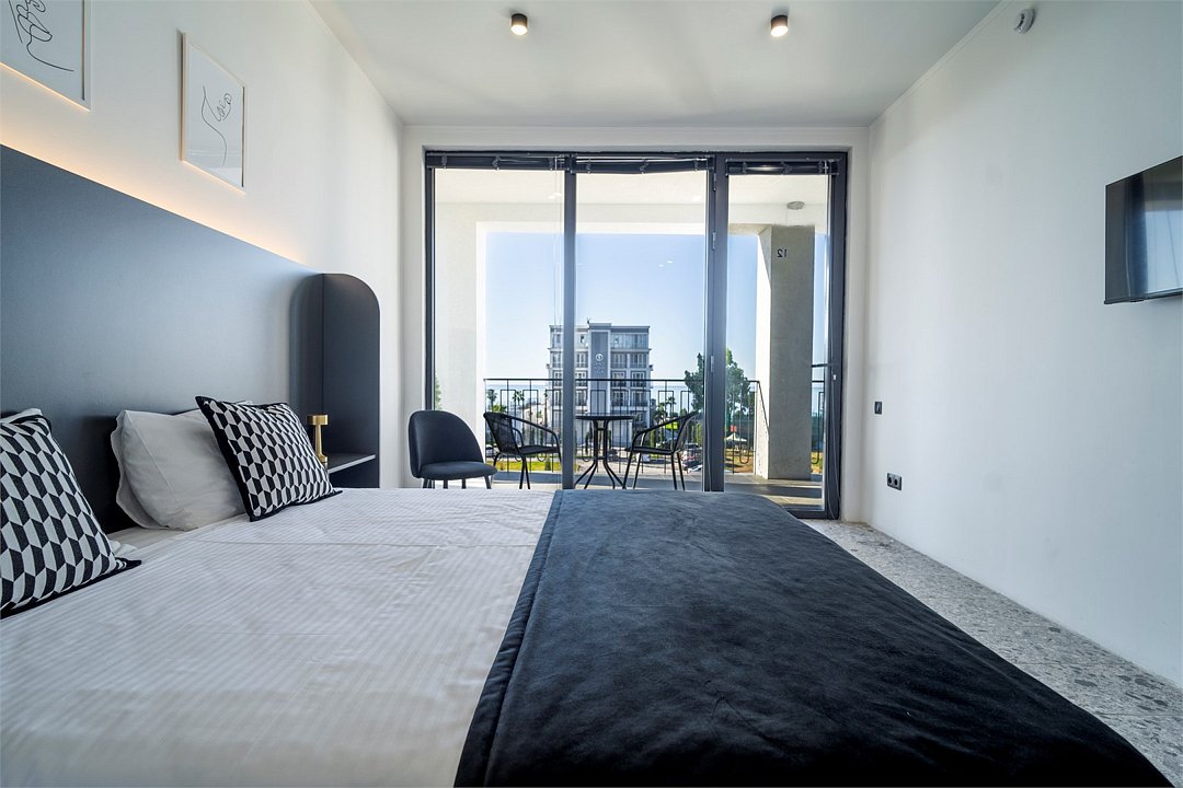 телевизор, Wi-Fi, интернет, кондиционер, фен, электронные замки, гидромассажная ванна, санузел, халаты, банные полотенца, пляжные полотенца, тапочки, гигиенические средства, балкон с красивым видом, две односпальные или большая двуспальная кровать, тумбы, шкаф для одежды, вешалки, багажная тумба, зеркало, чайный набор, набор посуды, обслуживание номеров, сейф, ковровое покрытие, вид на море, кулер на этаже, стаканы, стул, внутренний телефон, мини-холодильник, рабочий стол, чайная станция, уборка номера, СПАВ гостиничном номере