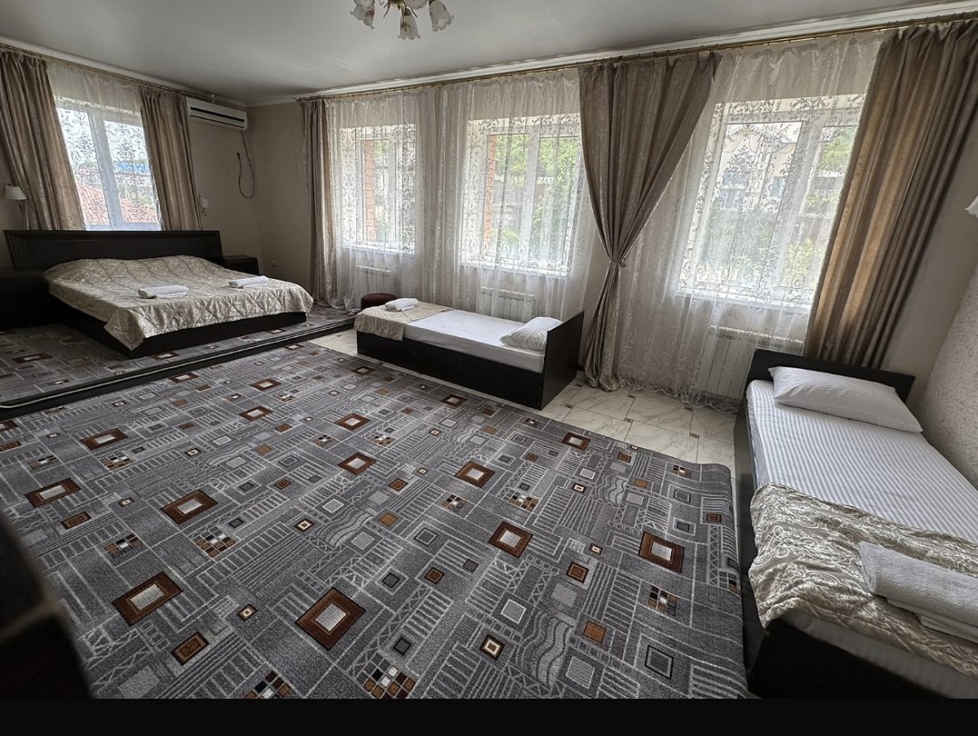Номер 34 в гостинице «Аврора Хиллс» — это просторный и уютный четырёхместный номер, оснащённый одной двуспальной кроватью и двумя удобными полуторными. Идеально подойдёт для семьи или небольшой компании.