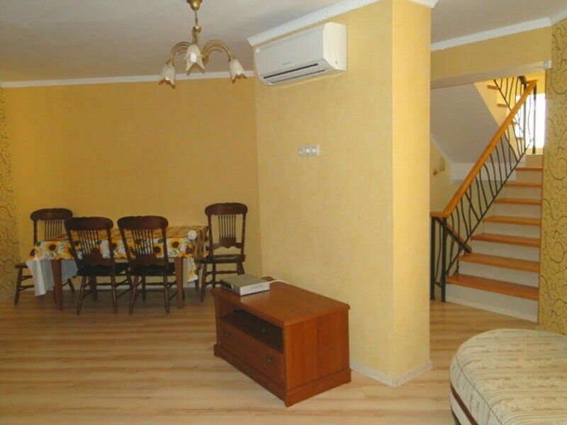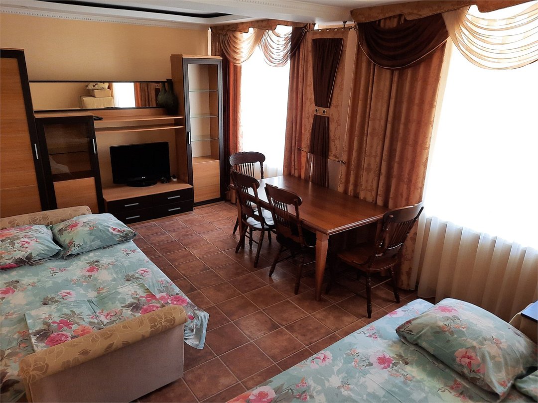 Номер «Полу люкс» - 40 м2, находится на втором этаже 2-х этажного коттеджа. 2 комнаты, две односпальные или одна двуспальная кровать, раскладной 2-х местный диван, Wi-Fi, собственная ванная комната, фен, балкон, шкаф или гардероб, кондиционер, холодильник, телевизор с плоским экраном, сушилка для одежды.Услуги и удобства