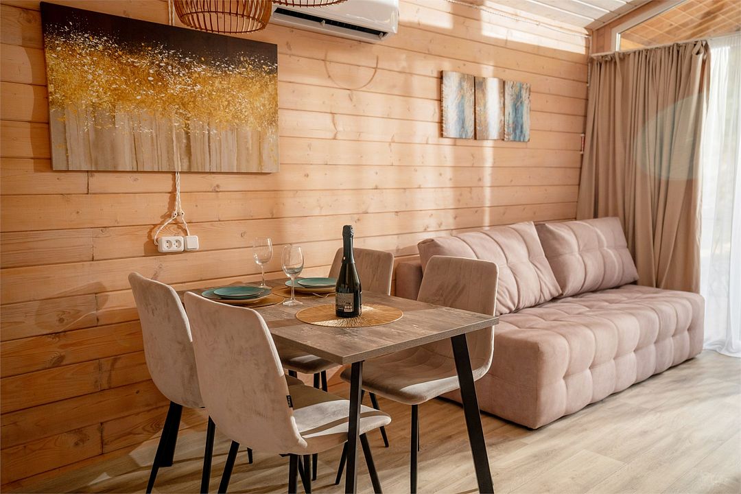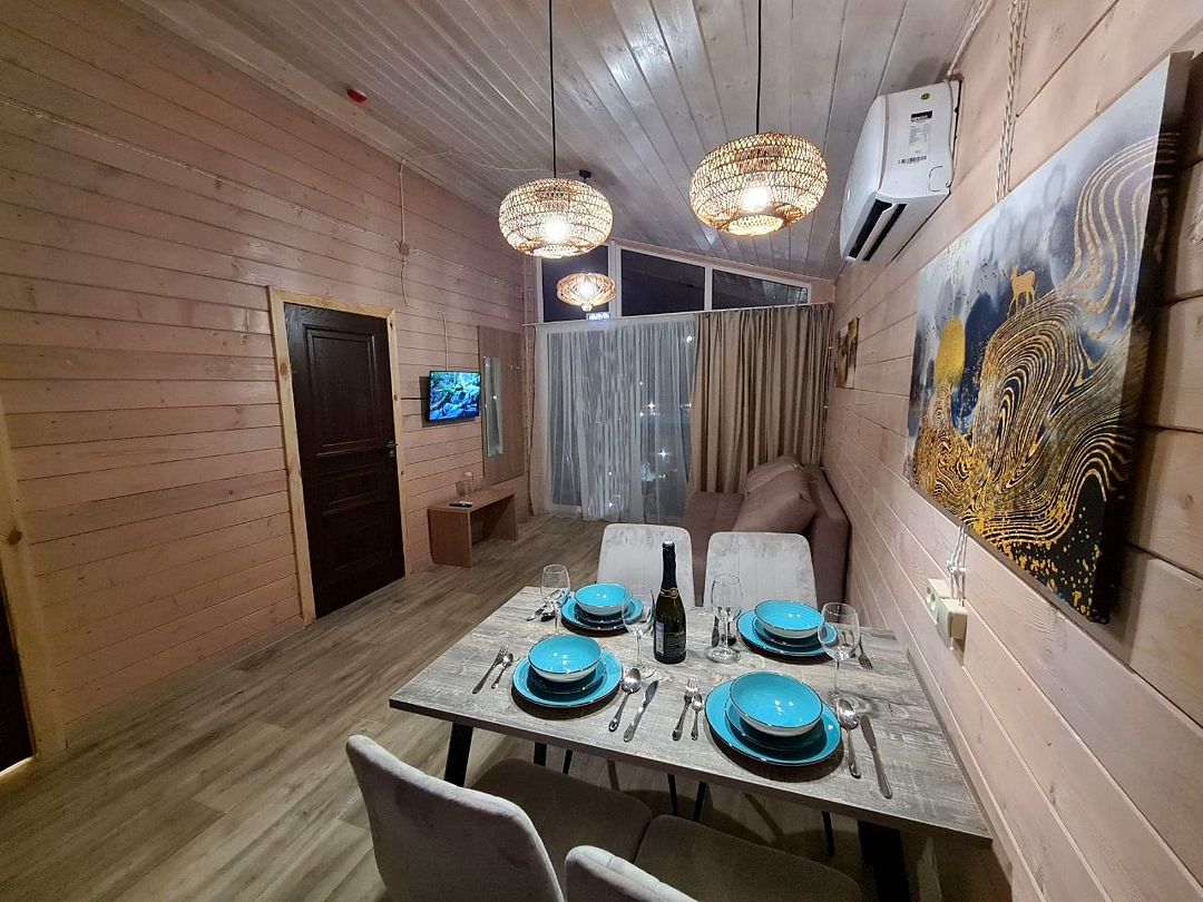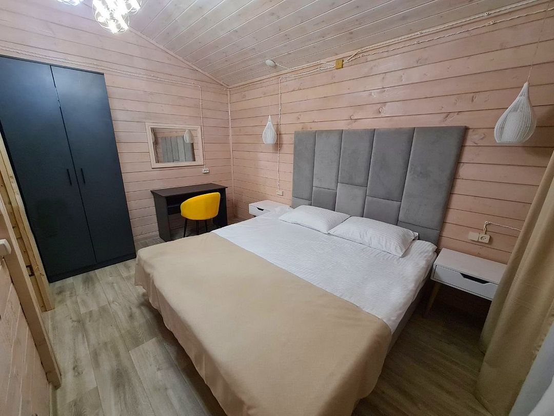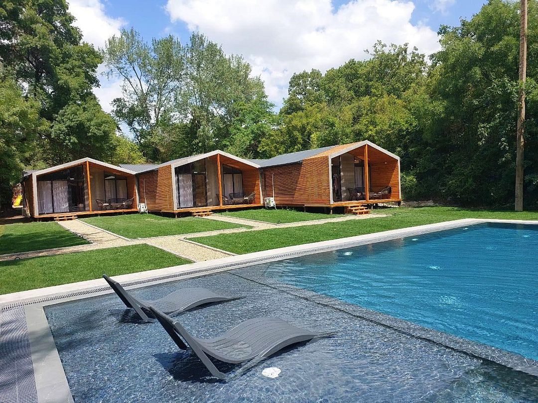 Семейный отдыхДостоинстваДля семейного отдыха в выходные – отличный вариант! Территория прекрасна: зеленая и очень уютная. Бассейн просто замечательный - теплый, с отдельной зоной для детей. На территории также есть прекрасная детская площадка. Особо хочется поблагодарить персонал за чуткость и внимание к пожеланиям гостей. Это очень ценно! Домики очень уютные, все продумано до мелочей, есть вся необходимая посуда. Да, слышимость присутствует, но мы жили со стороны леса и нас ничего не беспокоило.