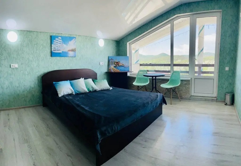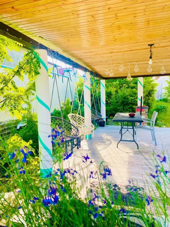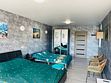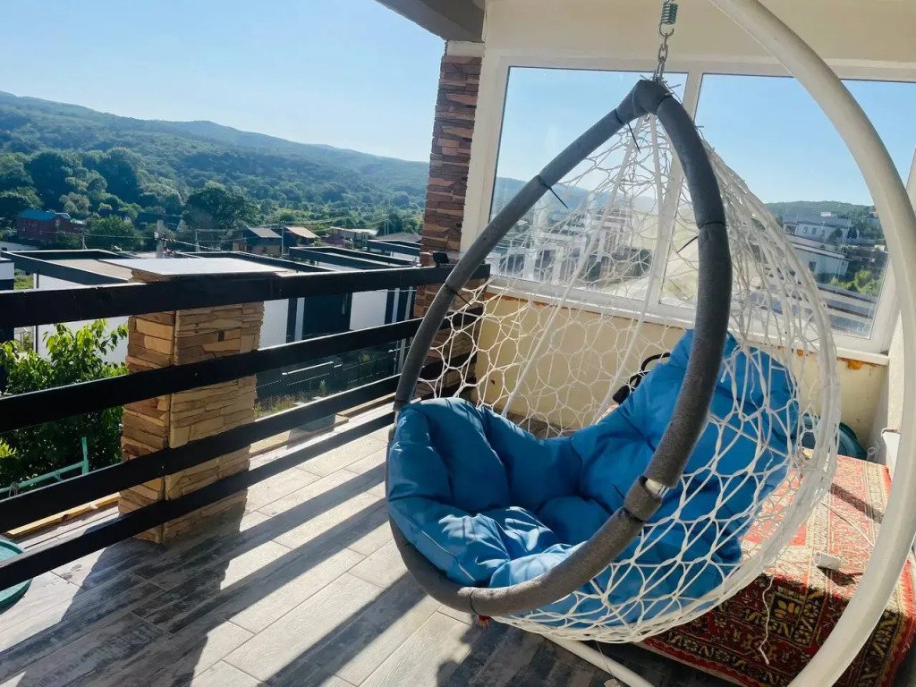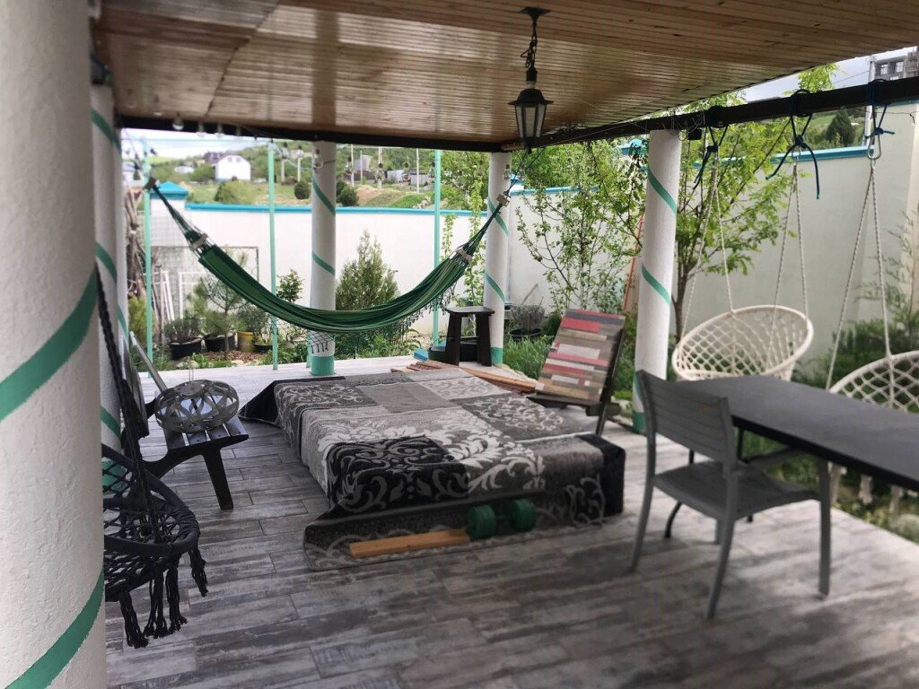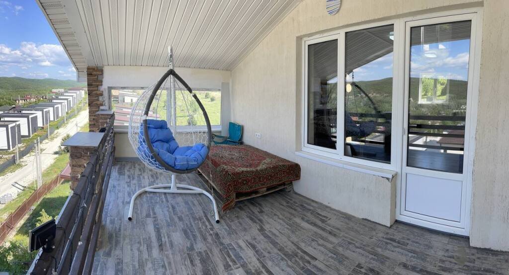 Комфортная двухместная комната в коттедже. В комнате: двуспальная кровать, тумбочка, шкаф, терраса с качалкой-коконом и диваном. Санузел на этаже.