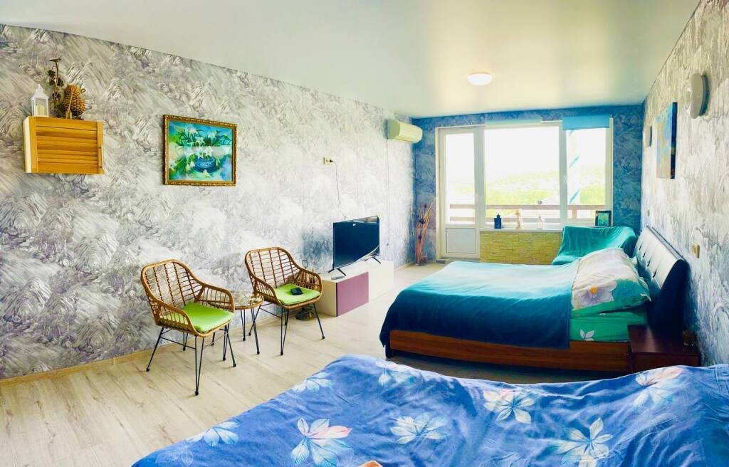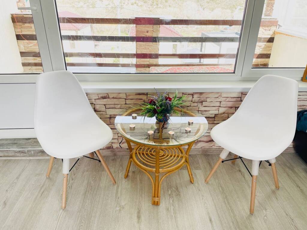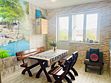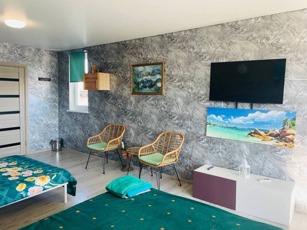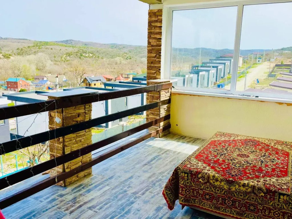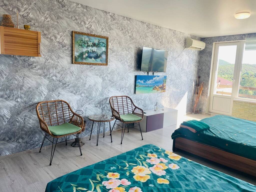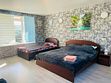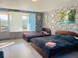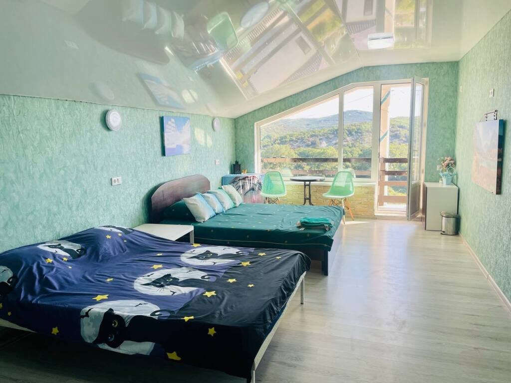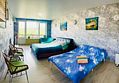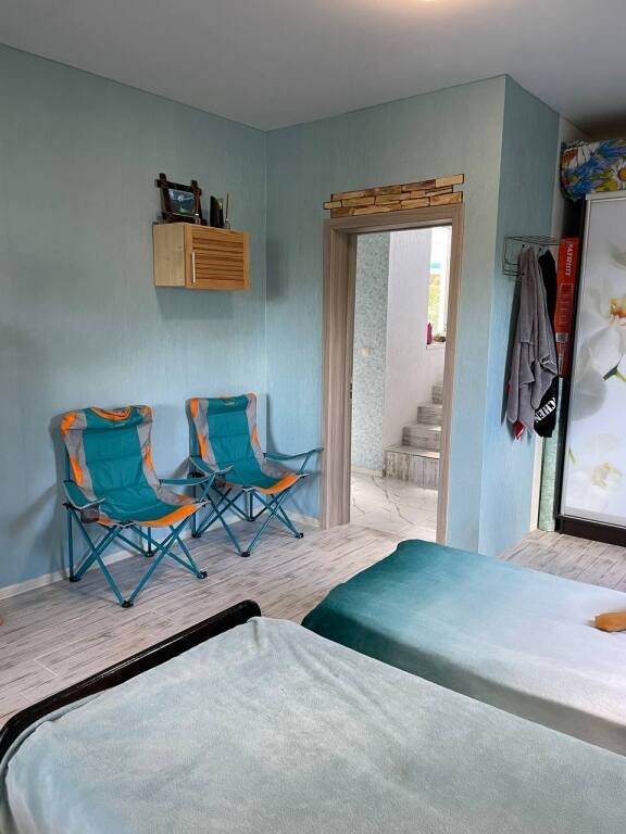 Трехместная комната в большой террасой. На террасе имеется качалка - кокон. В комнате: две двуспальные кровати, кондиционер, телевизор, стол, стулья, шкаф, терраса с качалкой-коконом. Санузел на этаже.