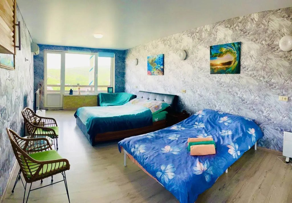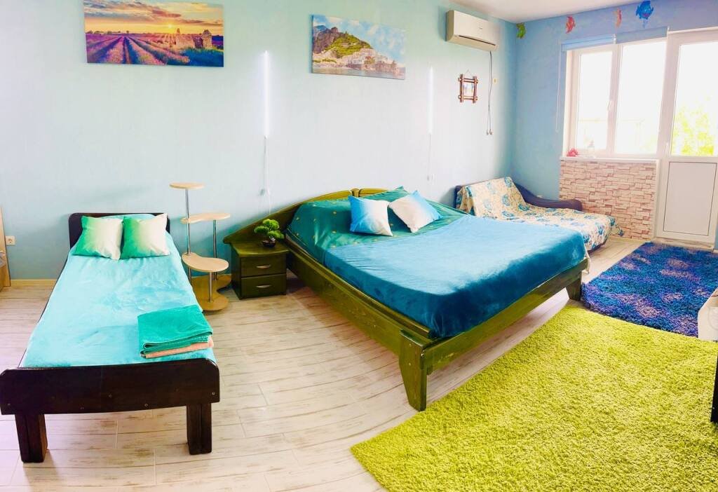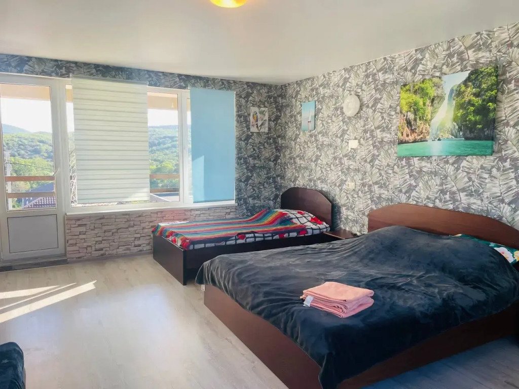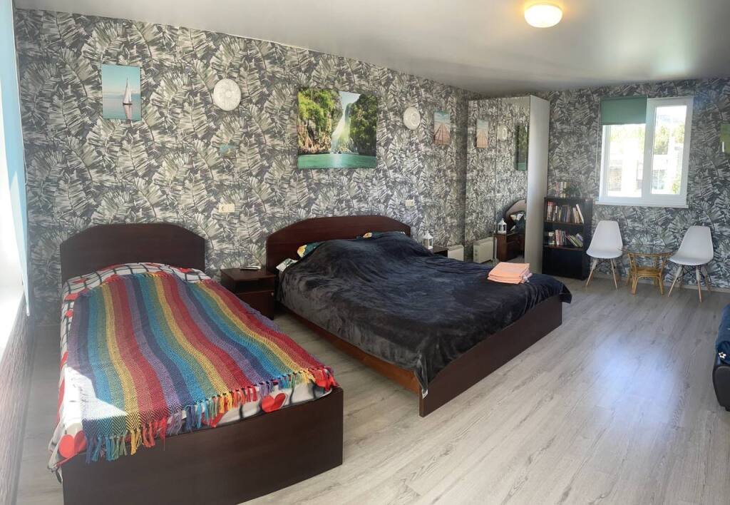 Комфортная четырехместная комната в коттедже. В комнате: двуспальная кровать, односпальная кровать, кресло-кровать, тумбочки, кондиционер, шкаф. Санузел на этаже.