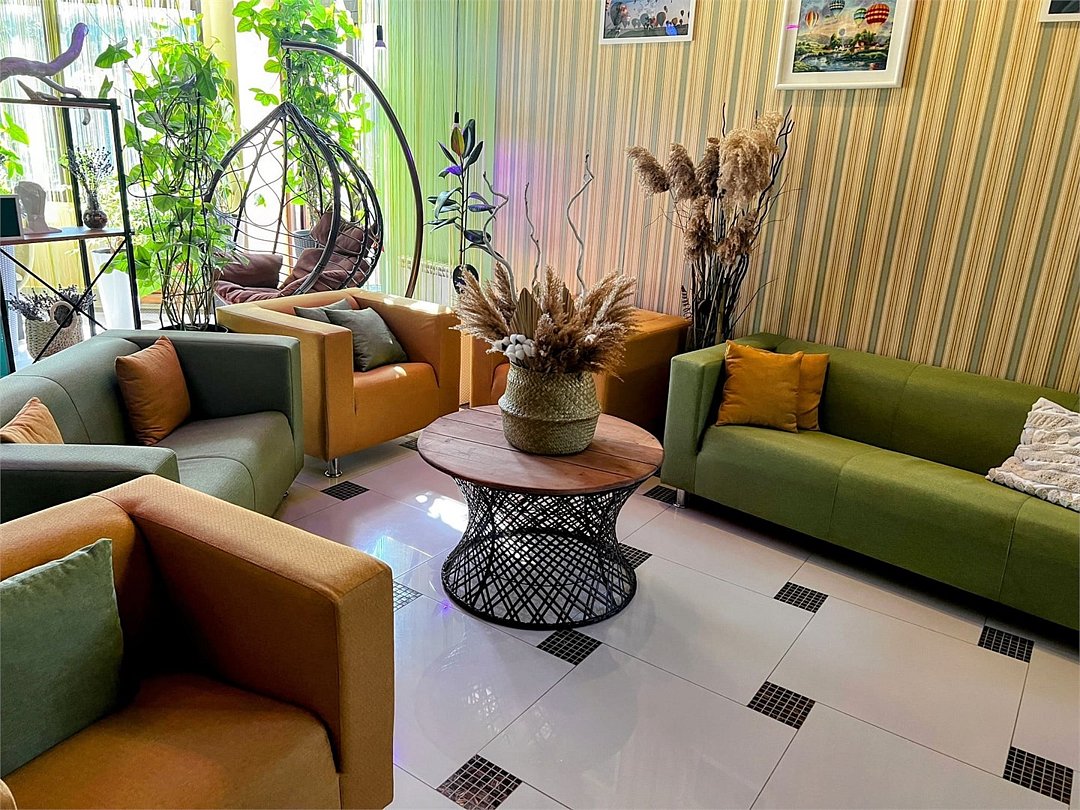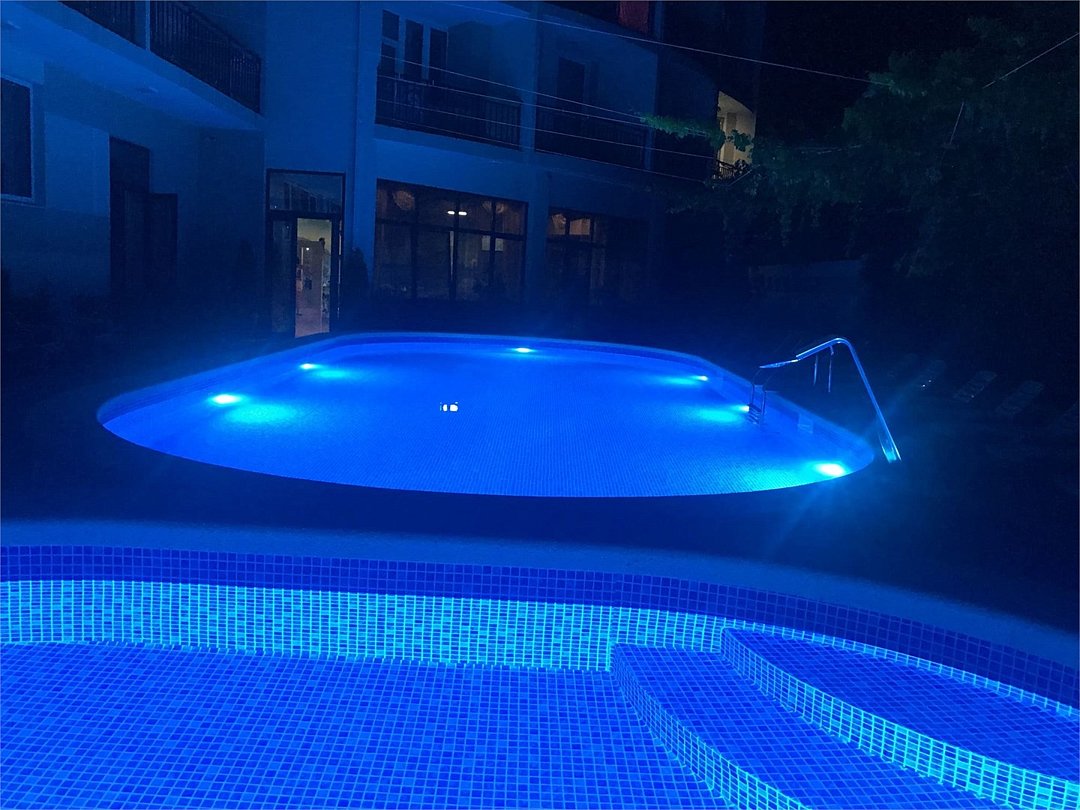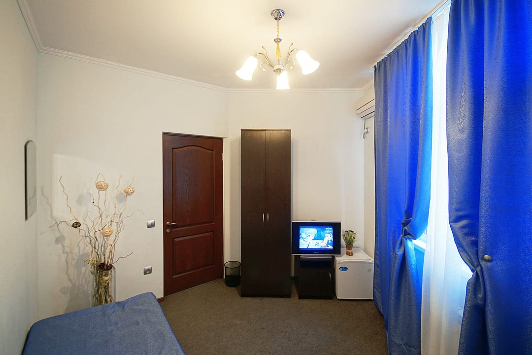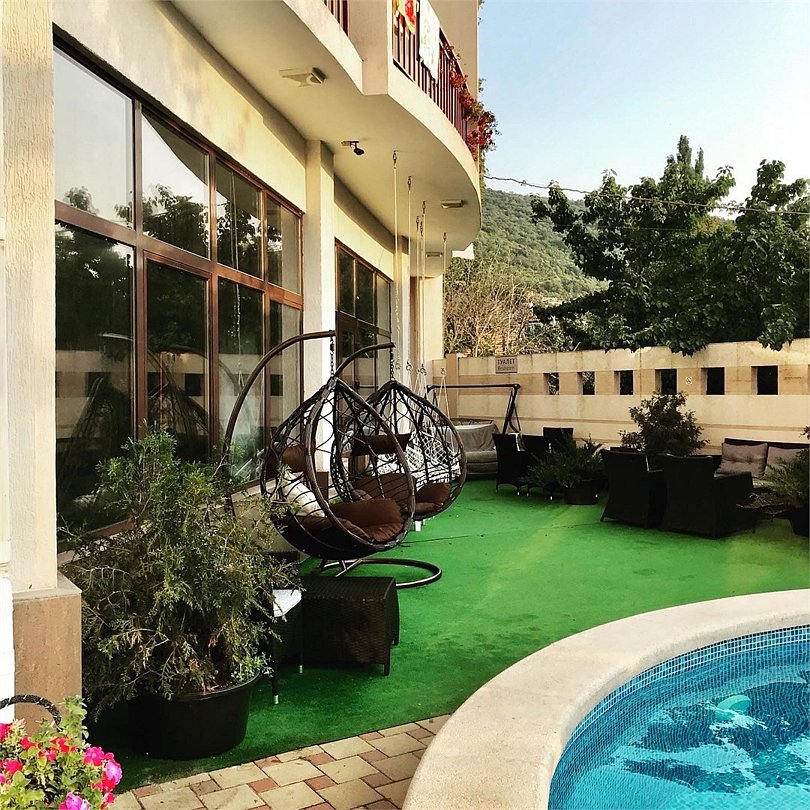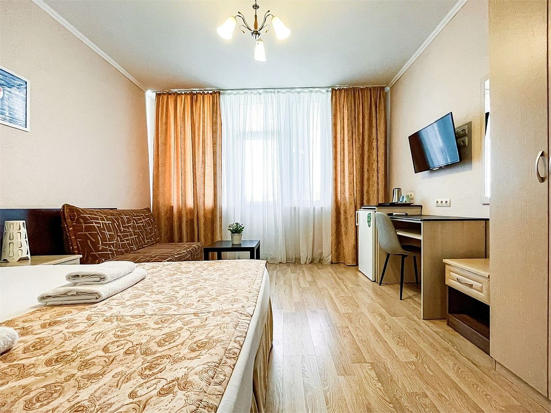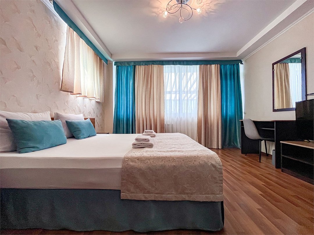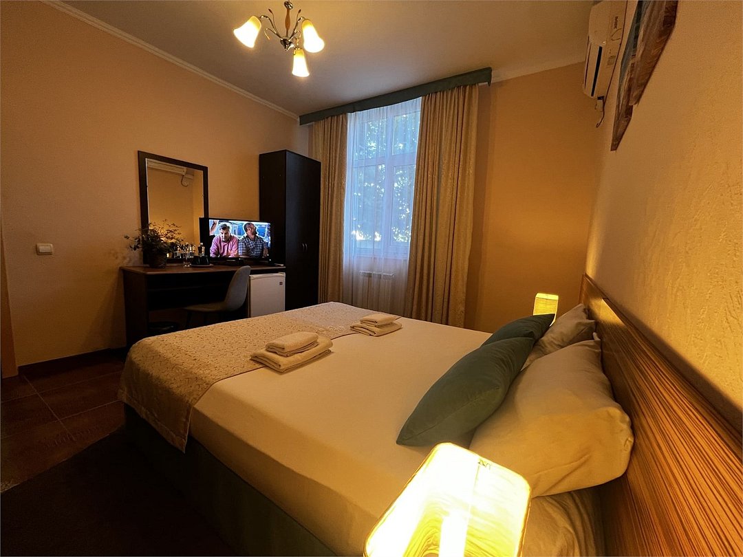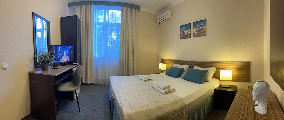 Пятиэтажный корпус отеля занимает небольшую территорию площадью 1000 кв.м. Жилой фонд рассчитан на единовременное заселение 84 отдыхающих. Гости могут выбрать как эконом вариант с общим санузлом на этаже, так и разместиться в просторных семейных номерах или комфортабельных Люксах. Все номера оснащены сплит-системой, есть телевизор и холодильник, везде кроме класса Эконом имеется собственный санузел с душем или ванной, Апартаменты оборудованы кухней.