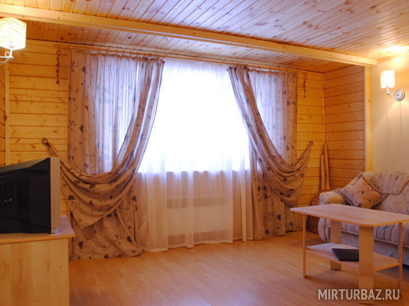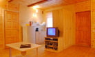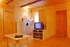 Гостиная-холл: теплые тона дерева в отделке, уютная мягкая мебель, спутниковое телевидение и стереосистема.