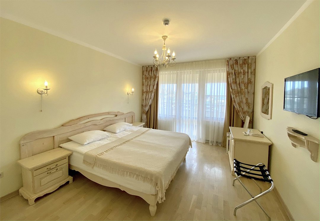 На 1 и 3 этаже расположены просторные номера категории Полулюкс. Номер площадью 30 кв. метров с большой двуспальной кроватью выполнен в стиле прованс и создает уютную, комфортную атмосферу. Номер может удовлетворить любую потребность гостя, оборудован высокотехнологичными средствами коммуникации . Вас ждет богатство использованных в отделке натуральных материалов, деревянная мебель ручной работы, душевая комната выполненная по индивидуальному проекту. Панорамные окна номеров позволят гостям насладиться прекрасным видом на город и море.Услуги и удобства