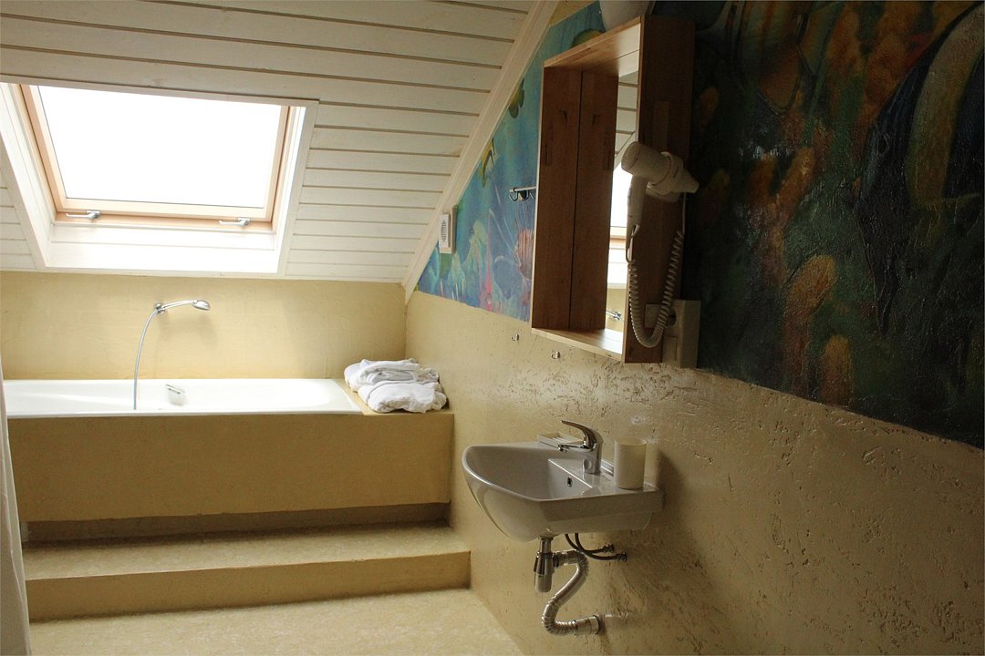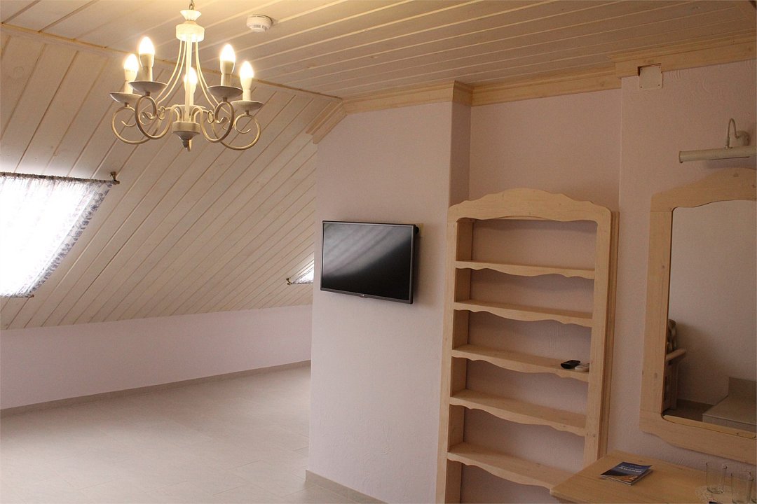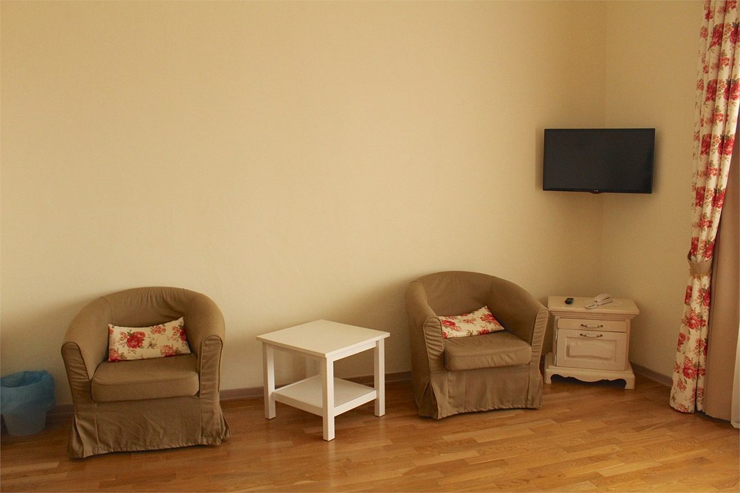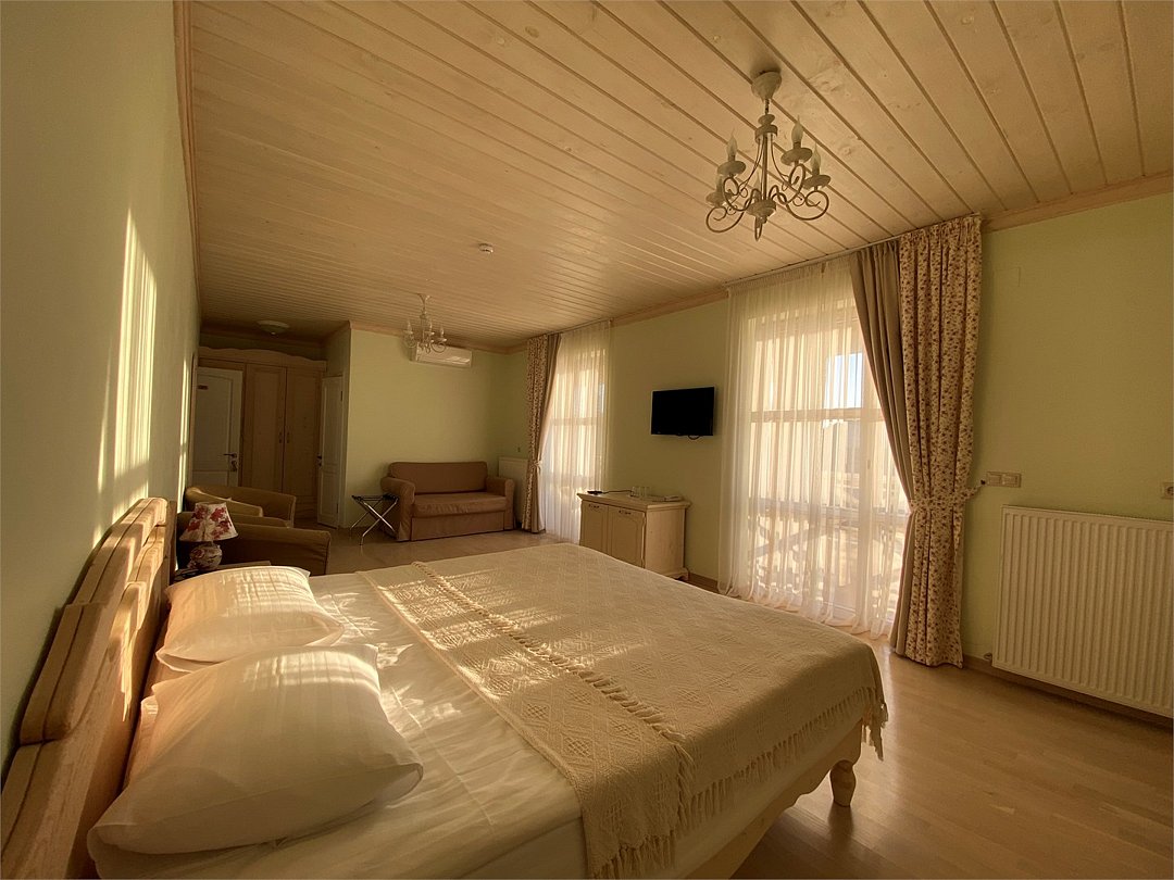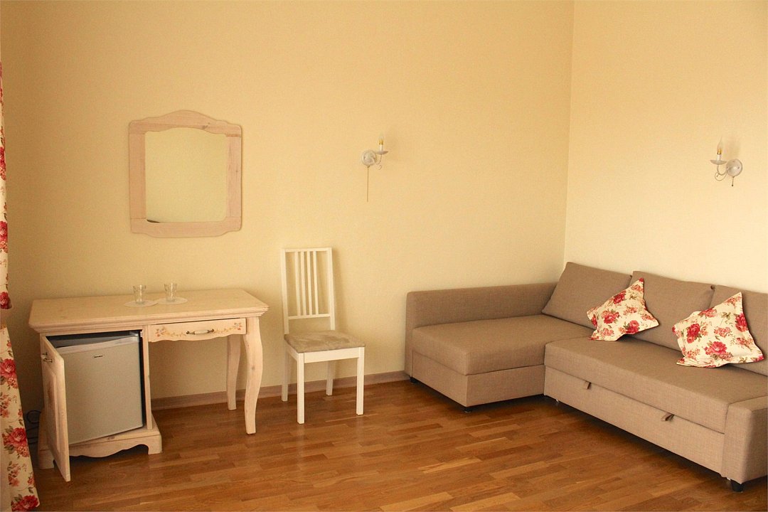 Просторный номер, который расположен в мансарде на четвертом этаже. Площадь номера 50 м.кв. Идеально подходит для компании 3-4 человек и для семей с детьми. Спальня и гостиная зоны разделены между собой . Так же в номере увеличенная по площади ванная комната, которая к тому же оборудована большой ванной прямо рядом с мансардным окном. Номер не имеет собственной террасы или балкона, но из мансардных окон открываются прекрасные виды на море, Анапу и окрестности.Услуги и удобства