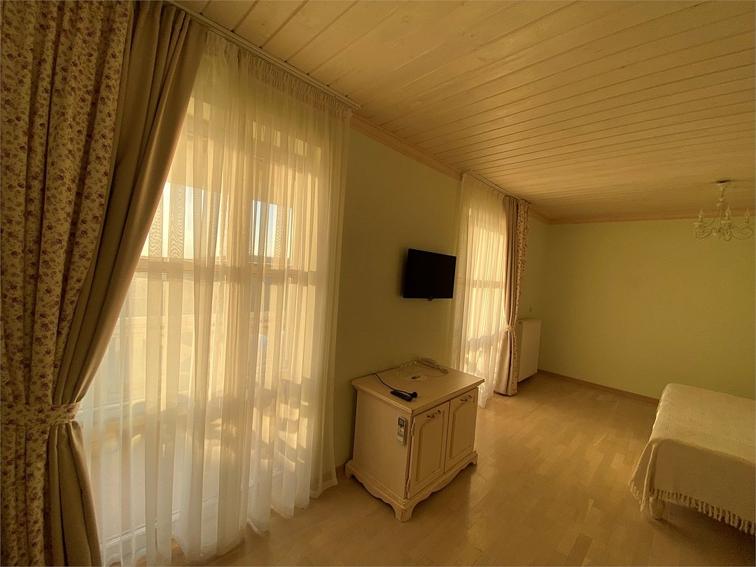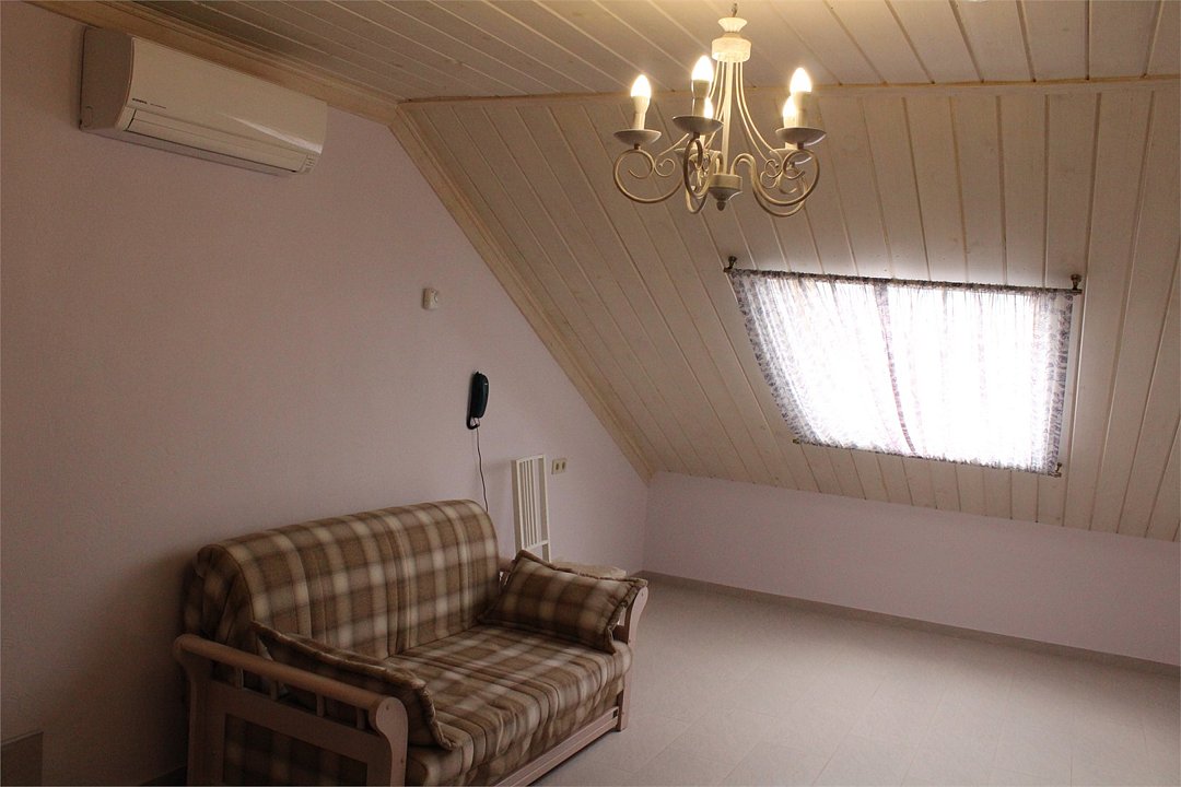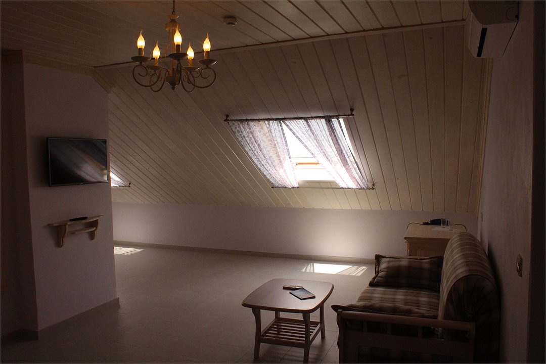 В просторном и уютном номере, расположенном в мансарде на 4 этаже, удобно разместиться семьям с детьми.Номер разделен перегородкой на две зоны-спальную и гостиную. Номер не имеет собственной террасы или балкона, но из мансардных окон открываются прекрасные виды на море, Анапу и окрестности.Услуги и удобства
