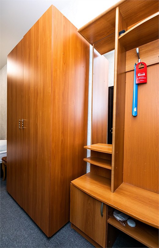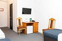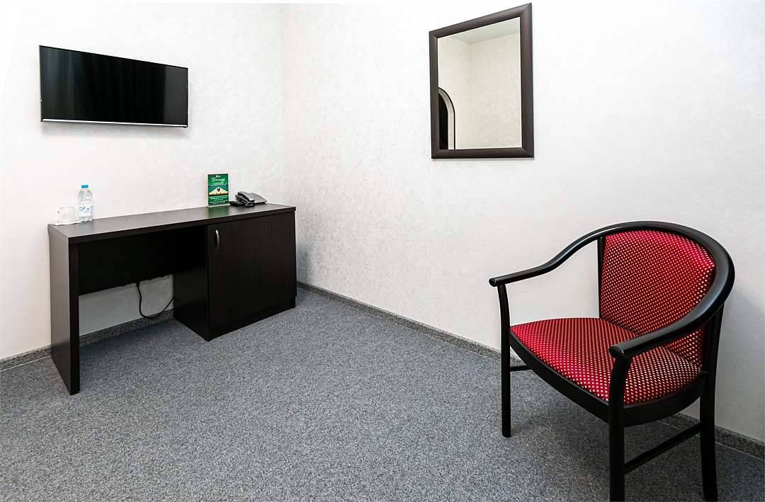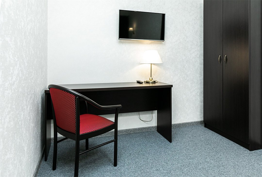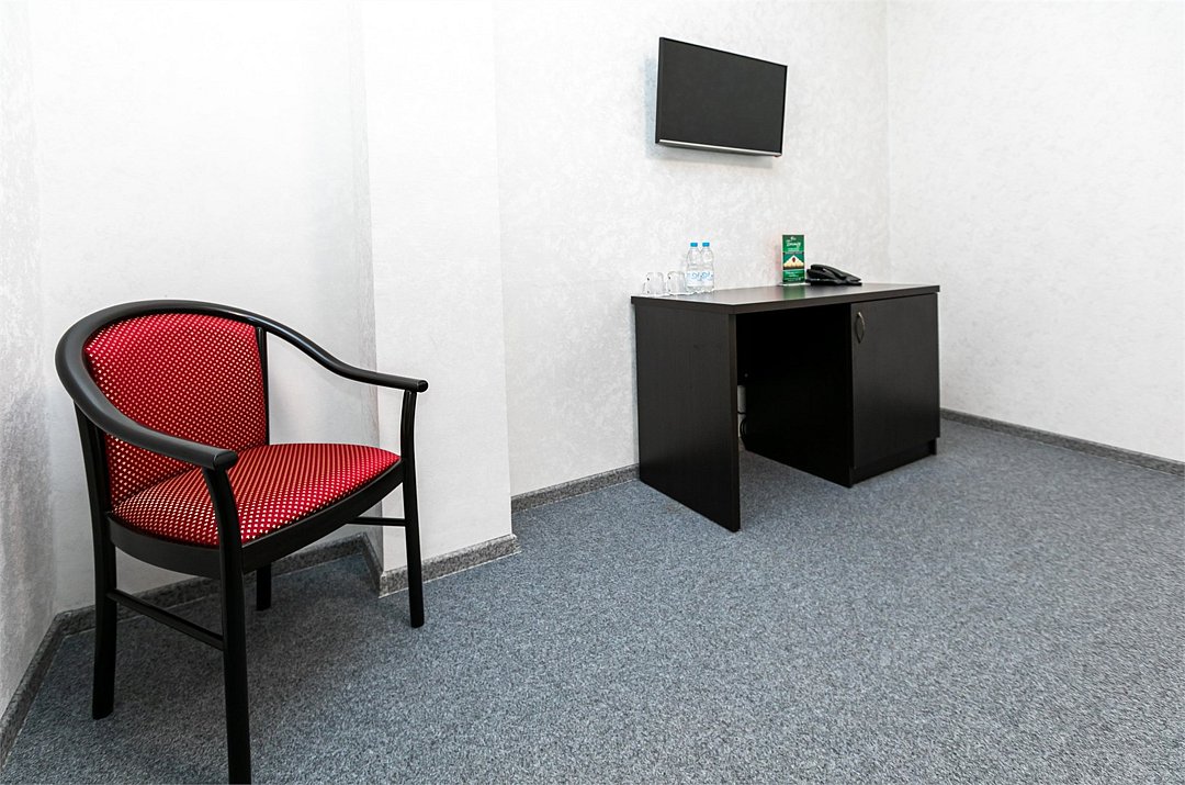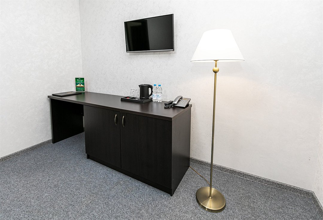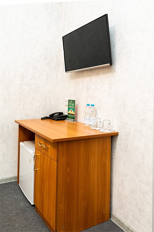 телевизор, кабельное телевидение, Wi-Fi, телефон, светильник, фен, система безопасности, односпальная кровать, тумбы, стулья, шкаф для одежды, вешалки, зеркало, обслуживание номеров, информационная карта, меню, питьевая вода, ковровое покрытие, отопление, кулер на этаже, окна выходят в атриум отеля, стаканы, стол, санузел на этаже, мини-холодильник, душ на этаже, без питомцевВ номере