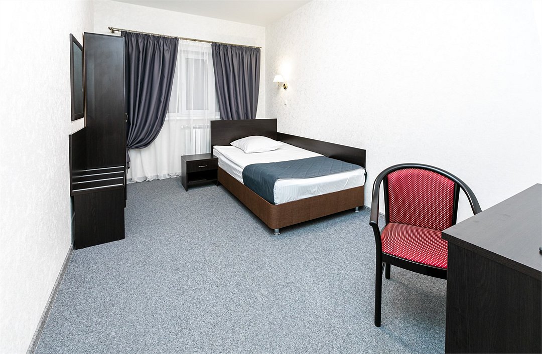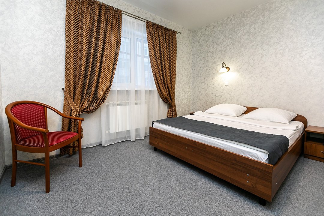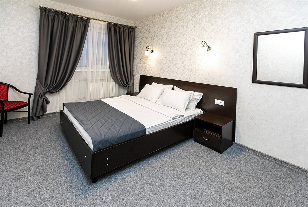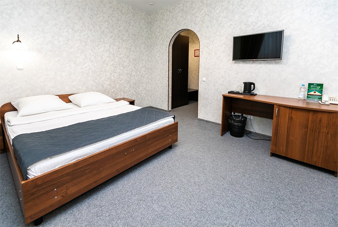 Однокомнатный номер площадью 26 кв.м., оснащенный двухспальной кроватью, есть возможность размещения на доп.месте.Услуги и удобства