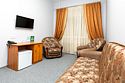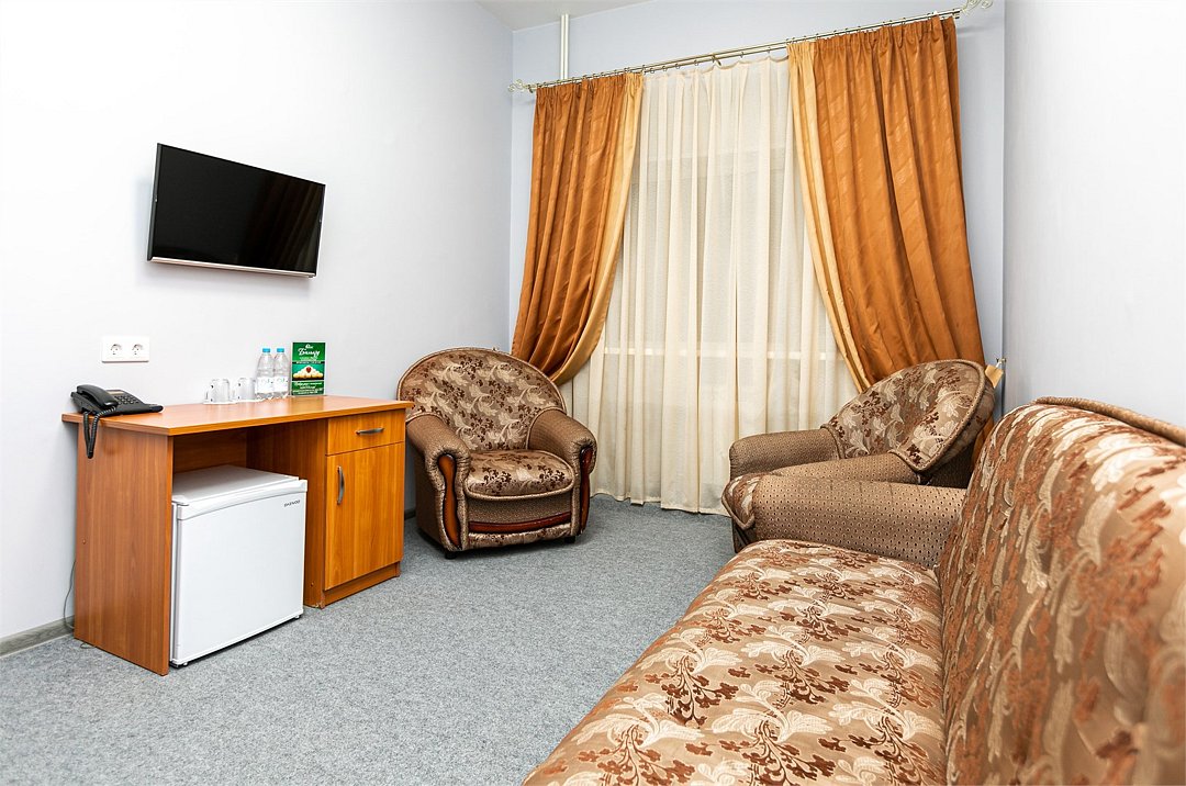 кабельное телевидение, Wi-Fi, телефон, ванна или душевая кабина, банные полотенца, тапочки, стулья, шкаф для одежды, вешалки, багажная тумба, зеркало, две комнаты, унитаз, раковина, питьевая вода, душ, кулер на этаже, вид во двор, окна выходят в атриум отеля, стаканы, стол, телевизор с плоским экраном, мини-холодильник, без питомцевВ номере