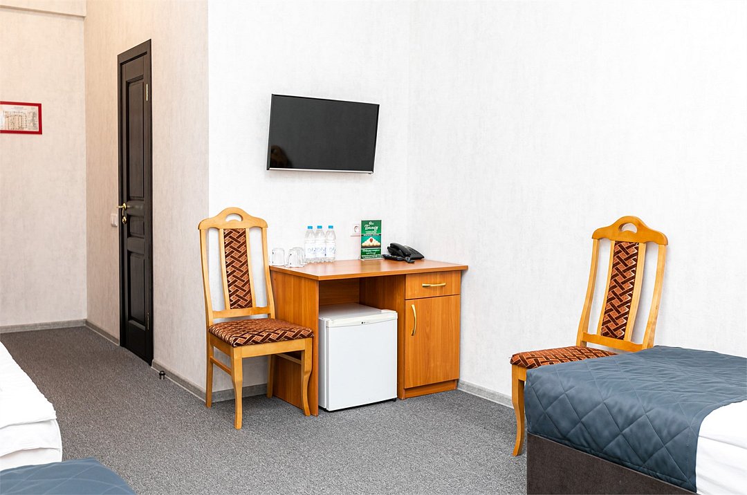 кабельное телевидение, Wi-Fi, телефон, банные полотенца, тапочки, две односпальные кровати, вешалки, багажная тумба, зеркало, унитаз, раковина, питьевая вода, душ, кулер на этаже, стул, стол, туалет, телевизор с плоским экраном, мини-холодильник, без питомцевВ номере