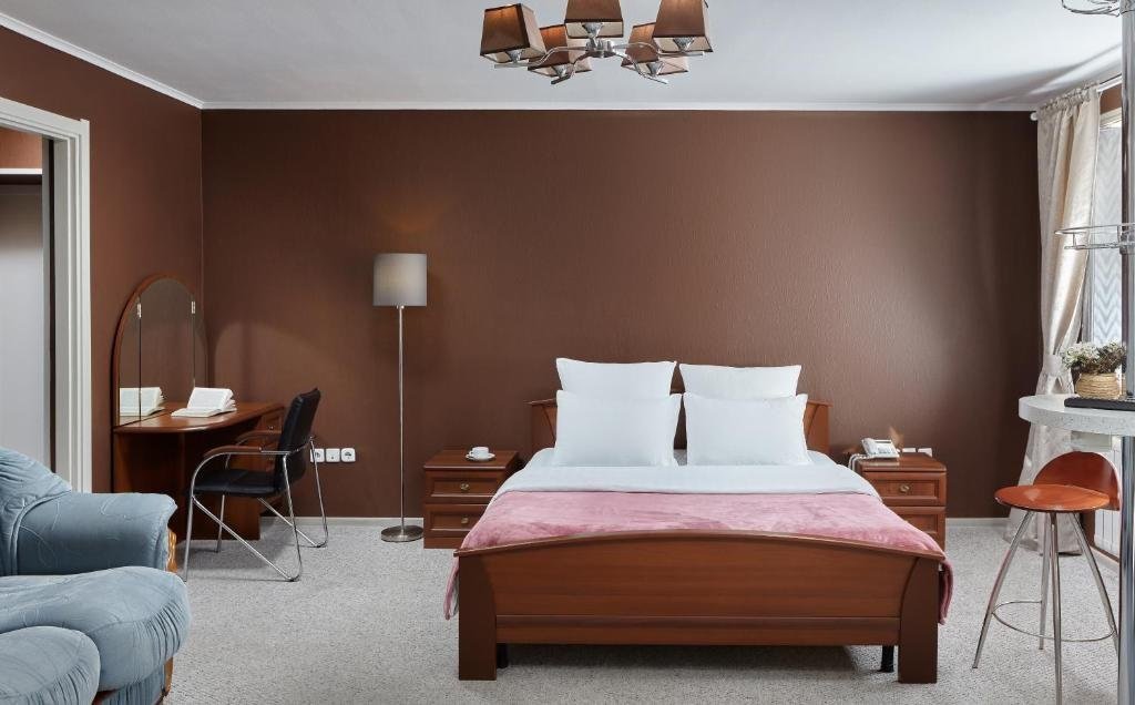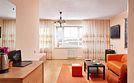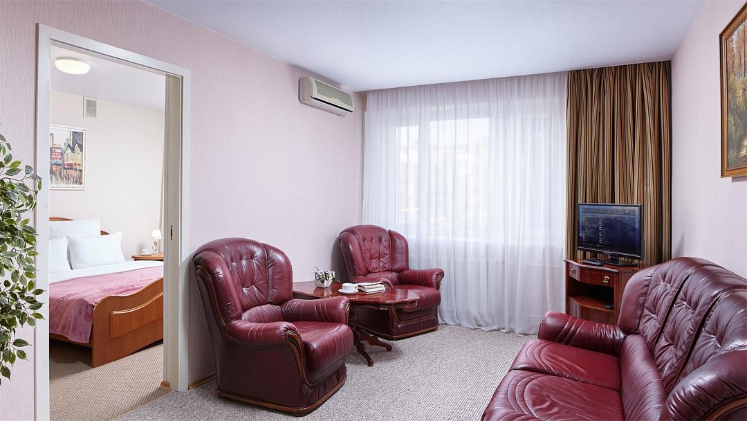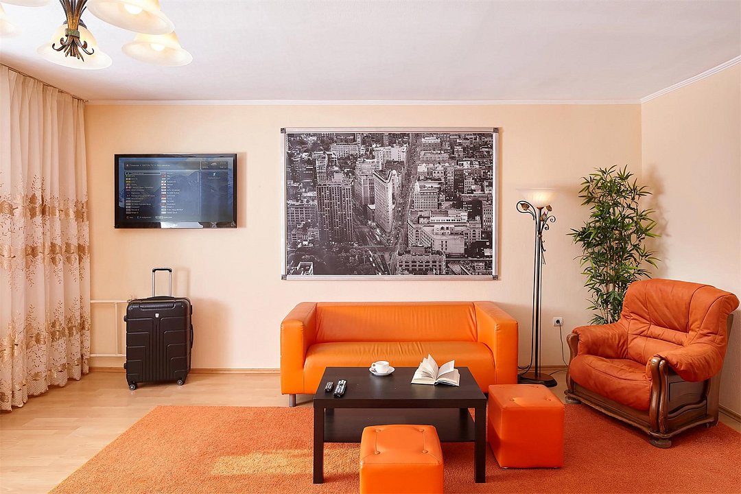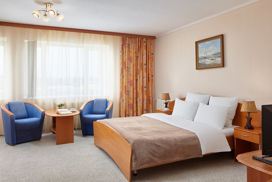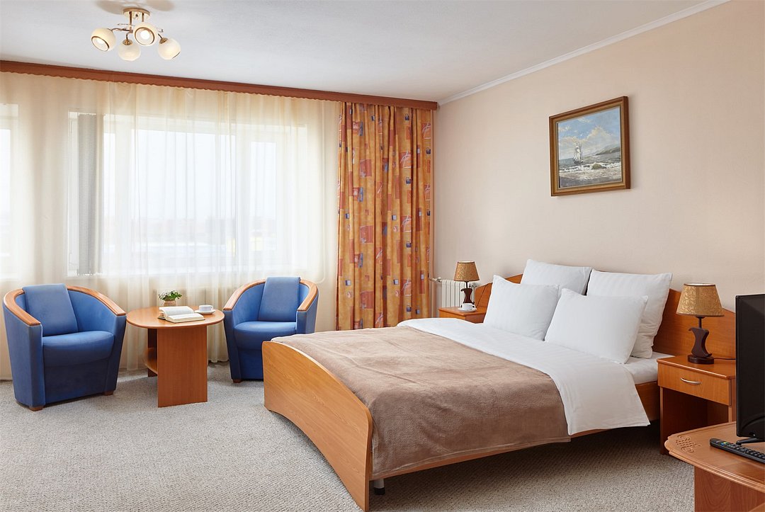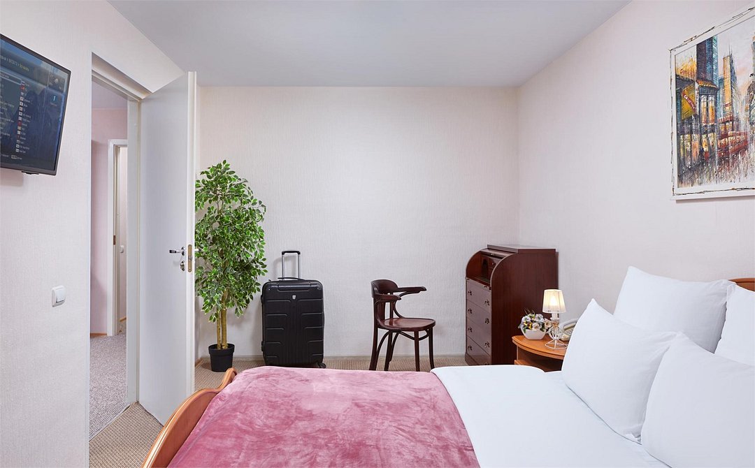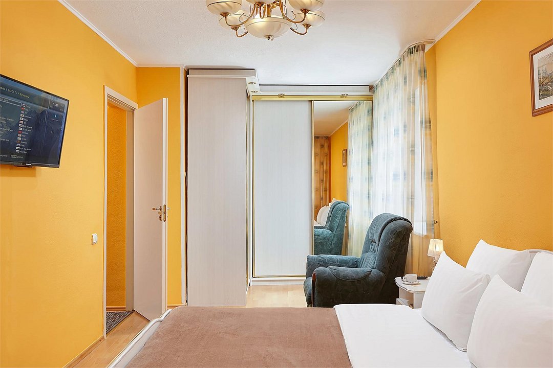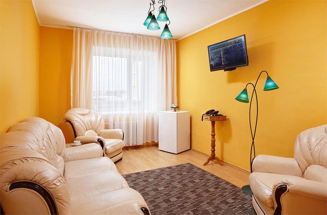 Однокомнатный номер повышенной комфортности с уютной зоной отдыха. В распоряжении гостей: коридор с гардеробом, ванная комната с туалетными принадлежностями, фен. В комнате диван, два мягких пуфика, журнальный столик, телевизор, телефон, чайник с набором для приготовления чая и кофе.Услуги и удобства