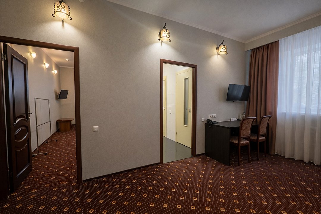 телевизор, Wi-Fi, интернет, телефон, светильник, фен, вентилятор, электронные замки, душевая кабина, санузел, халаты, банные полотенца, тапочки, кровать «King size», диван, кресла, тумбы, стулья, шкаф для одежды, вешалки, письменный стол, зеркало, ковер, мебельный гарнитур, информационная карта, меню, минеральная вода, унитаз, ковровое покрытие, отопление, душ, кулер на этаже, кресло, высокие потолки, стул, стол, тумба, туалетные средства, туалет, вид на парк, цифровое тв, диван-кровать, раскладной диван, внутренний телефон, телевизор с плоским экраном, мини-холодильник, москитная сетка, шкаф-купе, гостиничная парфюмерия, вид на лес, рабочий стол, можно с питомцамиВ гостиничном номере