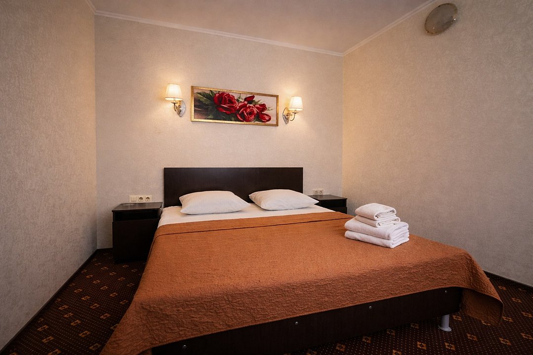 Номера средние с ковровым покрытием, тв плазма, в душевой шампунь/нель для душа/зубной сет в наличии. При заезде в номере бутылка воды с газом. Звукоизоляции в номерах нет! Не напрягаясь можете быть в курсе о чем говорят в соседнем номере. Затемняющих штор в номере нет, днём спать придётся при ярком свете дня. В номерах купил нельзя, курилка на веранде на этаже. На этажах много картин распечатанных с принтера.