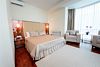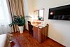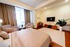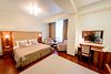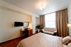 спутниковое телевидение, Wi-Fi, кондиционер, светильник, настольные лампы, фен, электронные замки, гидромассажная ванна, халаты, тапочки, гигиенические средства, кровать «King size», гипоаллергенное белье, кресла, стулья, шкаф для одежды, вешалки, журнальный столик, письменный стол, зеркало, ковер, две комнаты, звуконепроницаемые стены и окна, чайный набор, обслуживание номеров, информационная карта, меню, сейф, унитаз, раковина, питьевая вода, гостиная зона, отопление, душ, вид на город, кулер на этаже, ламинат, высокие потолки, стаканы, столовые приборы, туалетные средства, туалет, цифровое тв, раскладной диван, внутренний телефон, мини-холодильникВ гостиничном номере