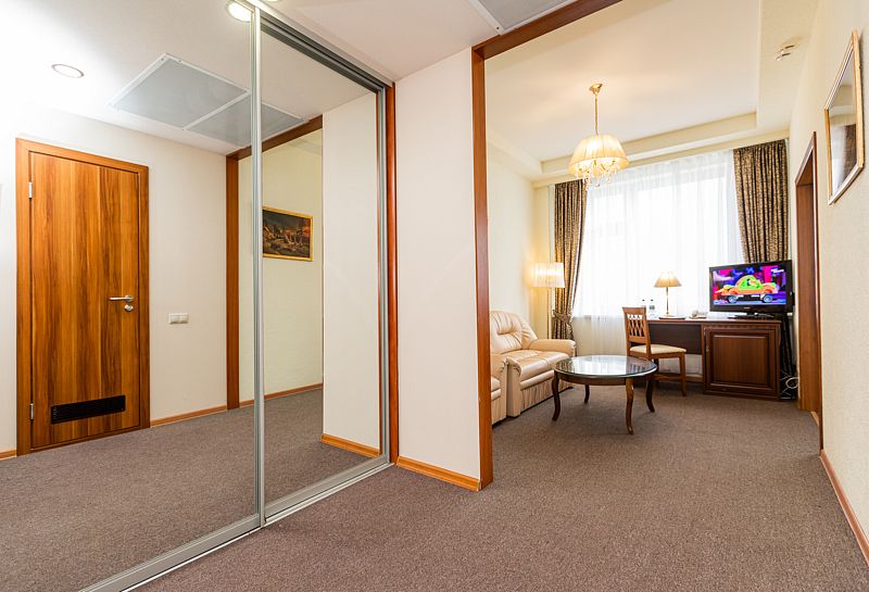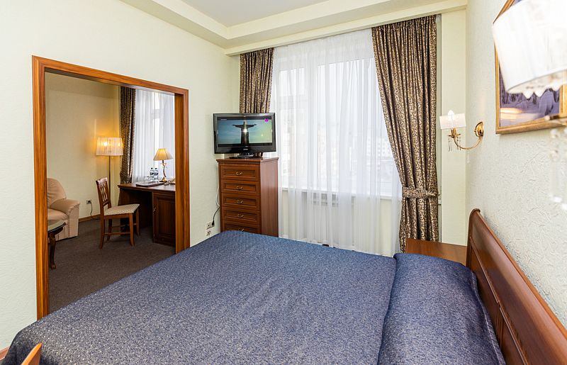 Просторный двухкомнатный номер площадью 35 кв.м., состоящий из спальни, гостиной и большой ванной комнаты с ванной.