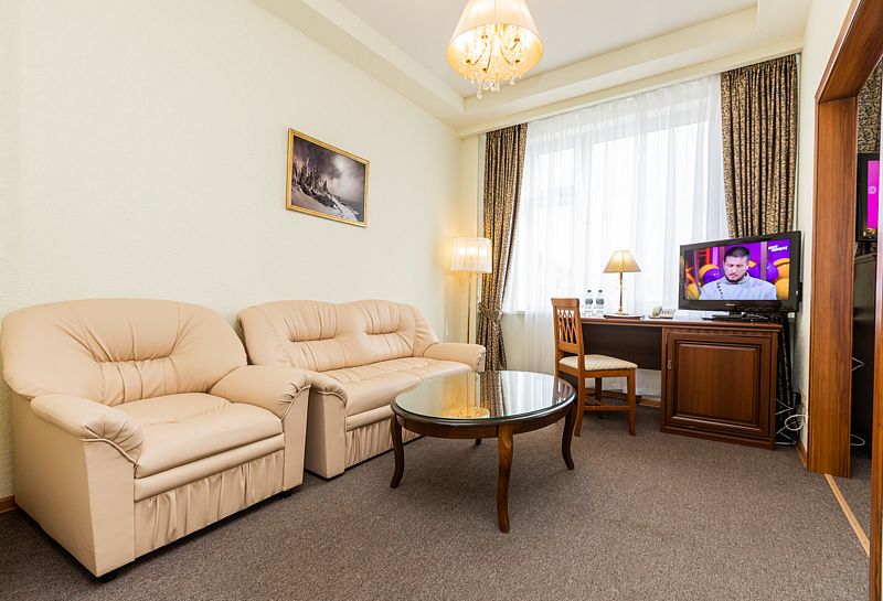 Гостиная делится на мягкую зону отдыха и рабочую зону. Оборудована мягкой мебелью с журнальным столиком, письменным столом с креслом и телевизором. Спальная комната оснащена двуспальной кроватью Queen Size (размер 160х200 см), туалетным столиком, комодом, шкафом и телевизором.