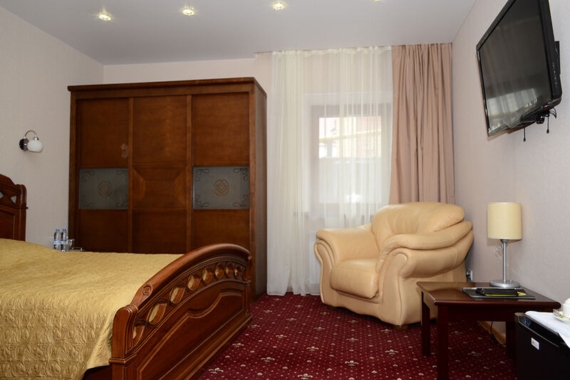 Двуспальная кровать, 2 кресла, LED-телевизор, чайник и посуда, мини-бар с напитками, сейф, кондиционер, ванна