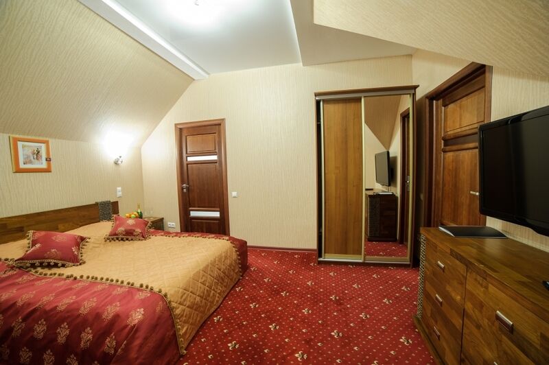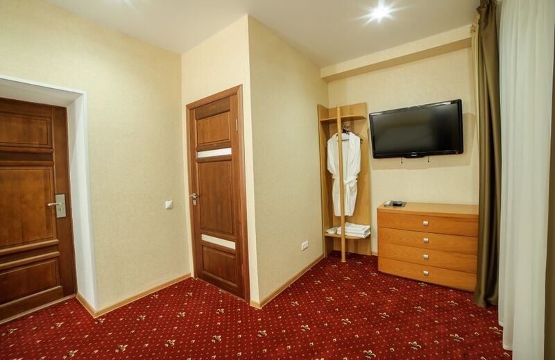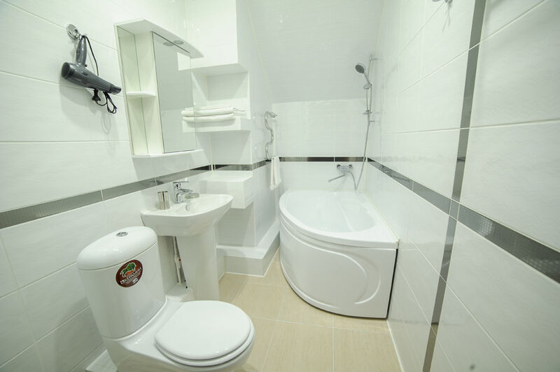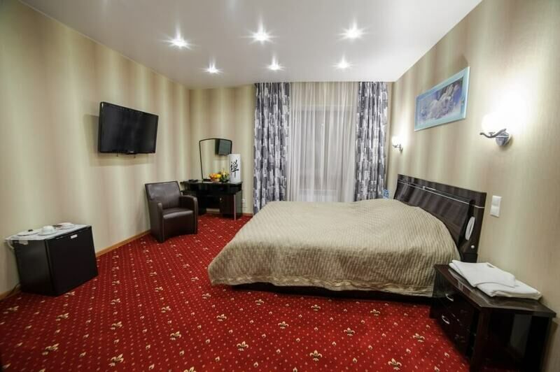 Двуспальная кровать, LED-телевизор, 2 кресла, чайник и посуда, мини-бар с напитками, сейф, кондиционер, ванна