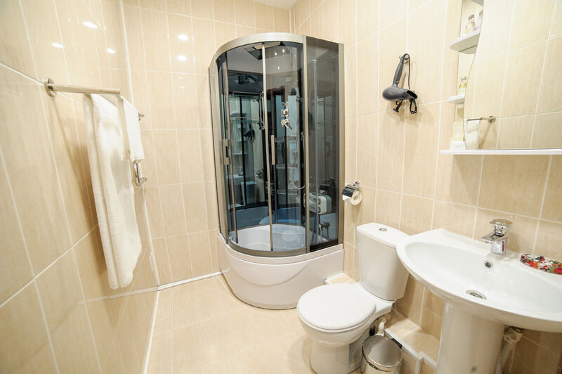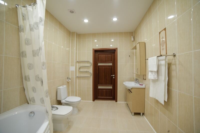 Двуспальная кровать, LED-телевизор, чайник и посуда, мини-бар с напитками, сейф, кондиционер, стиральная машинка, ванна