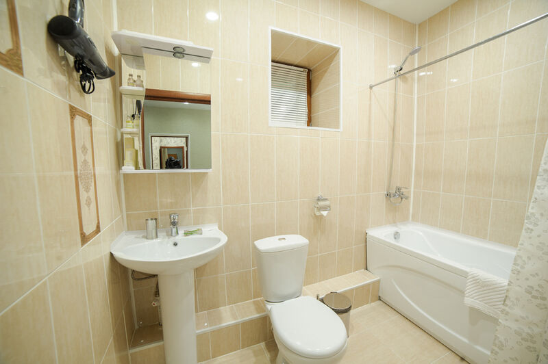 Двуспальная кровать, LED-телевизор, чайник и посуда, мини-бар с напитками, сейф, кондиционер, ванна